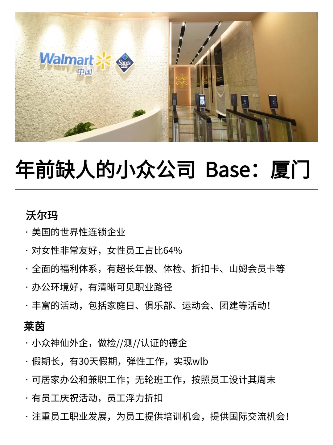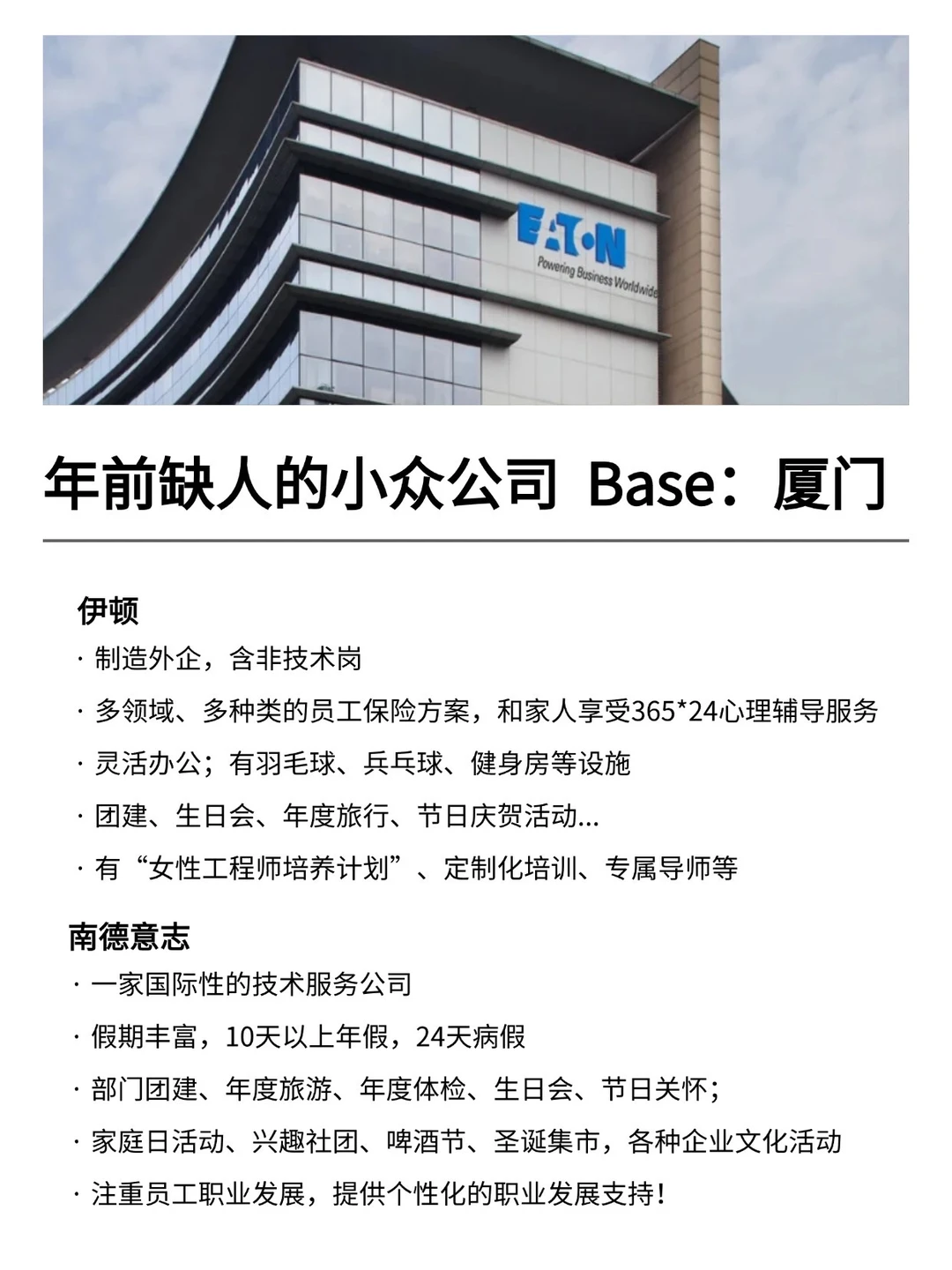 厦门发展真的越来越好,有不少小而美、冷门宝藏的公司,机会是真的很多的! 特别是有不少小众冷门的外企,真心建议大家可以去试试 · 大家不要觉得外企很难进 其实外企也有一些常规类、英语要求没有那么高的岗位 · 为什么还是值得去外企? ▪️氛围好,对女性友好,年假长,基本上都是10天起步 ▪️很多还都支持居家办公、福利完善,是真的能实现WLB ▪️待遇也还不错,年后找工作的真的可以考虑考虑~ · 坚持日更✊🏻,帮大家在找工作路上顺利拿 offer! ·