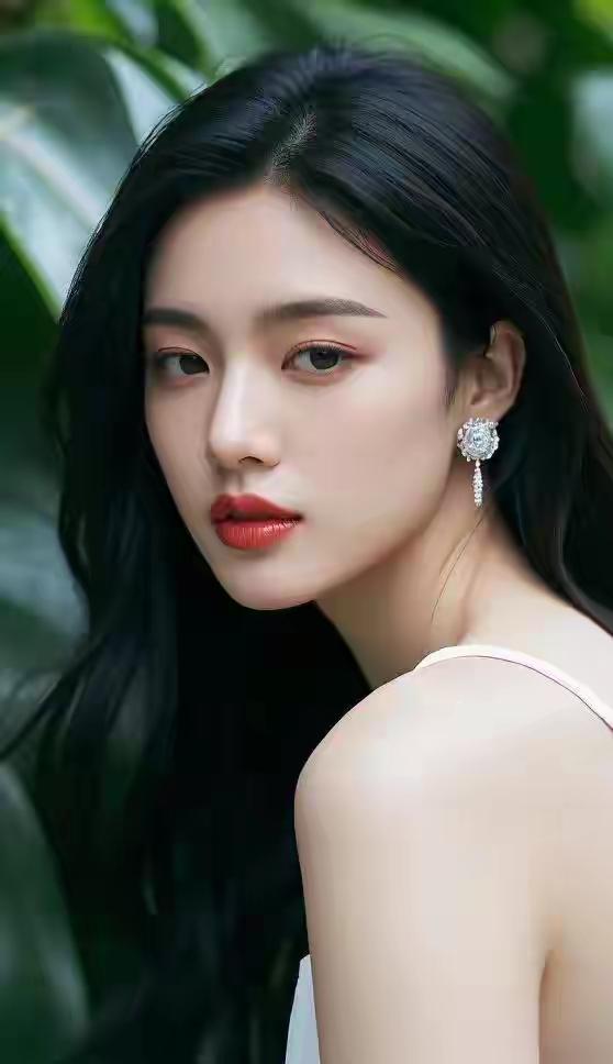 优雅黑发,红唇轻启,耳畔闪耀,自然绿意中绽放迷人魅力🍀❤️🌸🌴