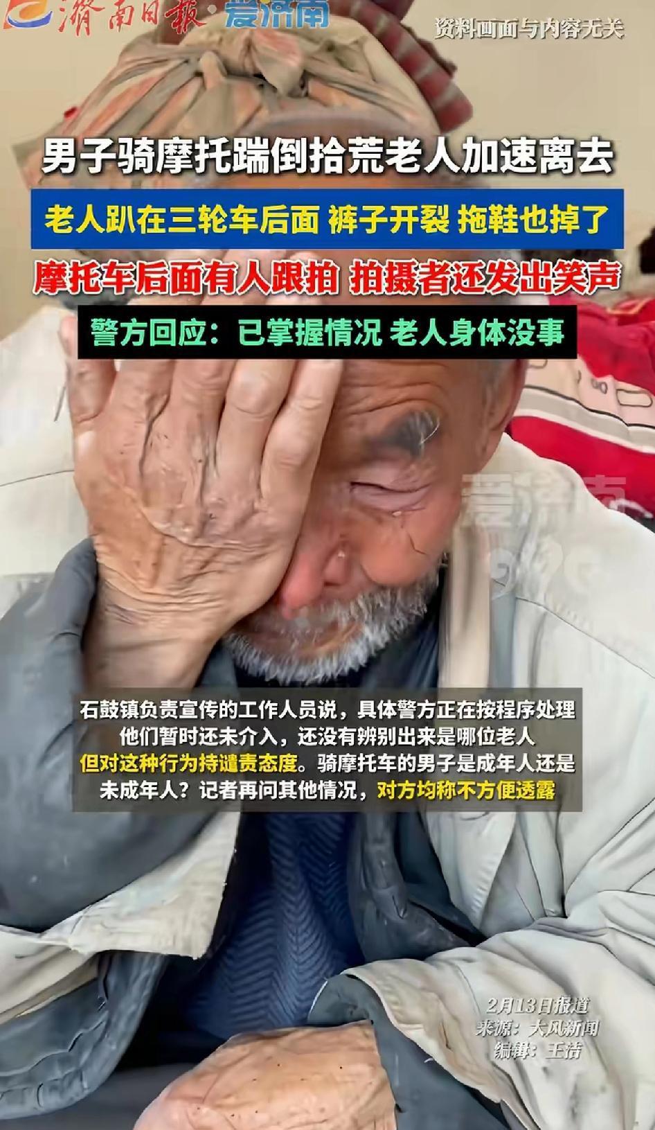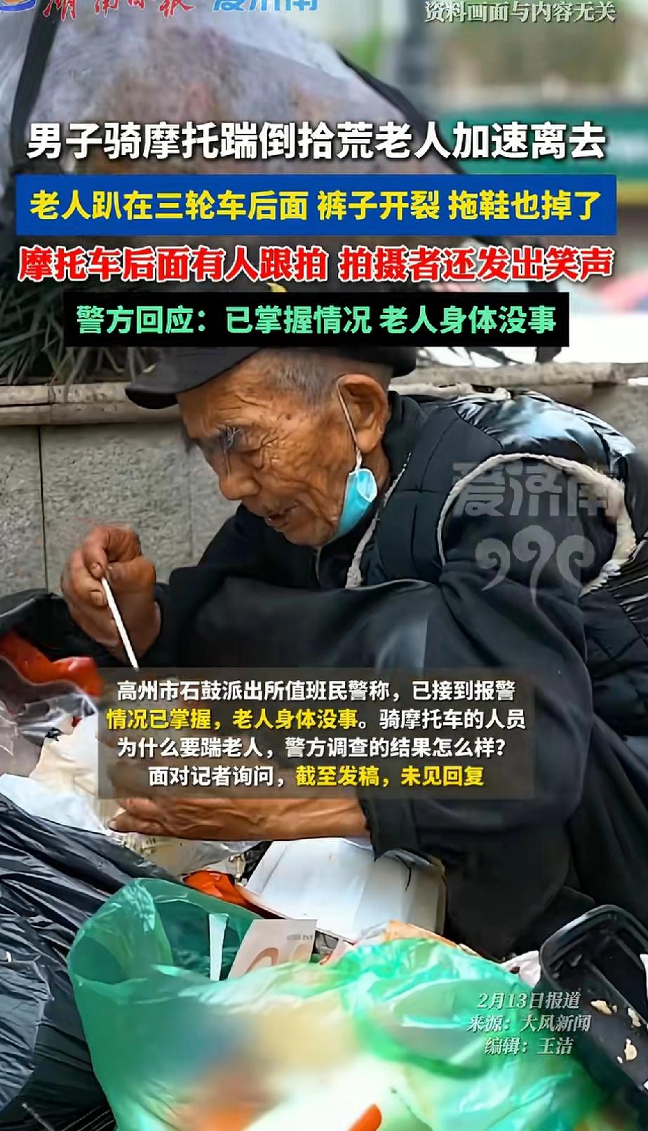 男子骑摩托车踹倒拾荒老人后加速离去,老人趴在三轮车后面,裤子开裂 拖鞋也掉了!摩托车后面有人跟拍,拍摄者还笑出声来。警方:已经掌握情况,老人身体没事。 2月12日,广东茂名高州一银行门口发生令人愤怒的一幕。一男子骑摩托车将拾荒老人一脚踹倒后加速离去,老人趴在三轮车后,裤子开裂、拖鞋也掉了,旁边跟拍者还发出笑声。 如此恶劣的行为,实在让人难以接受。拾荒老人本就生活不易,竟遭此对待。好在警方行动迅速,已找到涉案三人并下达拘留通知。 一定不能轻饶了这三个人,虽然老人身体没事,但这三人的行为太恶劣了。本来拾荒老人都是弱势群体,竟然被三人恶意伤害,实在可恶。 拾荒老人看似没有家人,但有法律保护,不该受此欺辱。 只要是人都会变老,一个人的品行是否端正就要看他对待弱者的态度。 这起事件也给社会敲响了警钟,希望大家都能尊重他人,莫让冷漠与暴力在生活中上演。