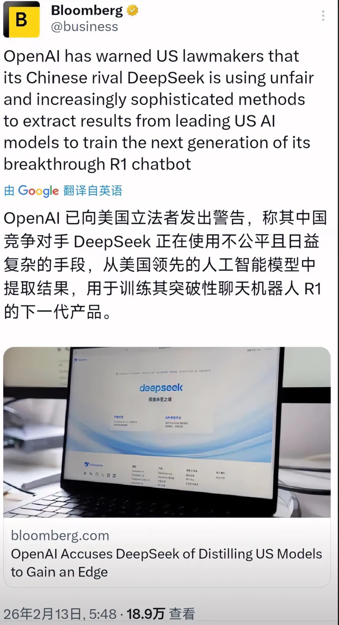 彭博社2月13日报道:“OpenAl已向美国立法者发出警告,称其中国竞争对手DeepSeek正在使用不公平且日益复杂的手段,从美国领先的人工智能模型中提取结果,用于训练其突破性聊天机器人R1的下一代产品。” 这就是典型的自己卷不动了,就怪别人跑得太快。 奥特曼急眼了。他急的不是什么技术被盗,他急的是DeepSeek没花几个钱,干成了他烧了几百亿美金的大事。 OpenAI口口声声说的那个“蒸馏技术”到底是什么?说白了就是让一个好学生给差生辅导功课。差生看多了好学生的解题步骤,自己慢慢也开窍了。这本身就是行业里公开的秘密,也是技术进步的常见路径。 但问题来了,这事到底违不违法?蒸馏本身不违法,违法的是你怎么拿到这个“辅导资格”。 如果DeepSeek真像OpenAI说的那样,用假账号、租用第三方服务器绕过限制去抓数据,那确实踩了红线。 可OpenAI现在这套说辞,听起来特像打麻将输了钱就掀桌子。你猜他们告状找的是谁?不是什么法院,是那个专门盯着中国搞事的“美中战略竞争特别委员会”。这哪是打官司,这就是告黑状。 说白了,这事儿的本质根本不是技术纠纷,而是面子问题。DeepSeek不仅跑得快,关键是它还把怎么跑的技术路线全公开了。这就等于把OpenAI身上那件“技术神坛”的袍子给扯了下来。你以前说自己多牛多神秘,现在发现原来路没铺对,有钱也白搭。 OpenAI现在急了,急着把技术问题变成政治问题。 只有这样,才能让美国国会继续砸钱,才能让那些限制芯片出口的政策显得“很有必要”。可问题是,如果人家真没偷,就是脑子比你好使、算法比你精呢?那这场闹剧就成了全世界看美国AI巨头自己打脸。 各位读者你们怎么看?欢迎在评论区讨论。