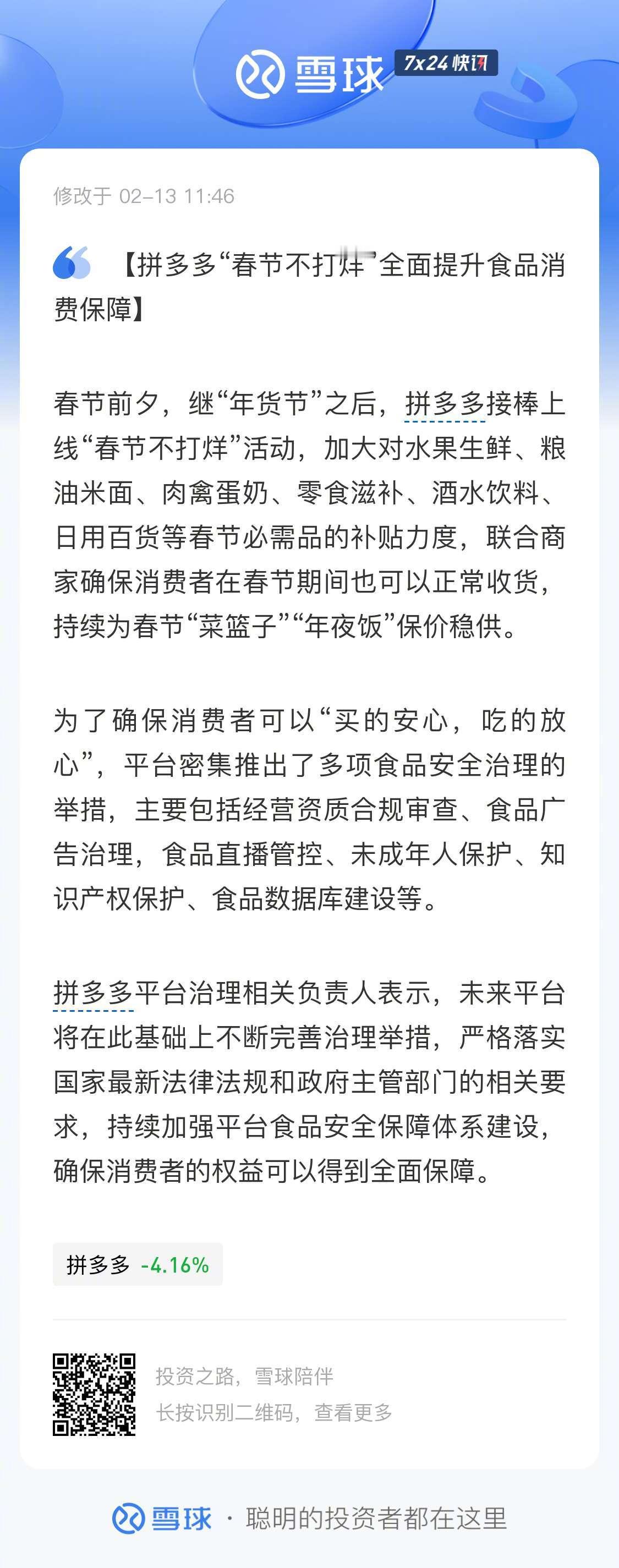 拼多多食品安全保障持续加码春节前夕,拼多多启动“春节不打烊”持续保供稳供,并密集推出多项食品安全治理举措,全面提升食品安全保障。为了保障食品类商家、品牌的知识产权,平台持续拓展了知识产权侵权投诉专属渠道,及时跟进处置权利人的知识产权维权行为。2025年,平台累计处置食品相关的侵权投诉数十万件,极大保障了食品商家的知产权益。