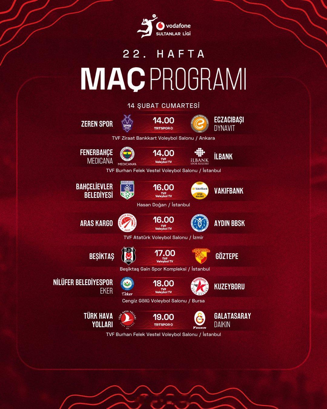 2025-2026女排土超 常规赛第22轮明天(14日)上演,竞赛日程如图。图中所示时间为土耳其当地时间,比北京时间晚5个小时,+5小时即为北京时间。如北京时间15日凌晨00:00,王媛媛 效力的加拉塔萨雷将在客场挑战土耳其航空。