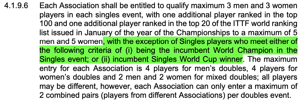 【参赛名单提交】国际乒联只接受符合资格的协会提交的正式提名,且该提名须由提名协会的负责人正式签署,并在截止日期前收到。但单打选手若符合以下任一条件,则不受此限:(i)是世锦赛现任单打冠军;或(ii)是世界杯现任单打冠军