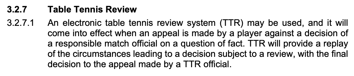 【TTR回放官员】当乒乓球回放系统(TTR)启用时,主裁判或助理裁判就事实问题作出的判罚,可由TTR官员根据3.2.7.1推翻。