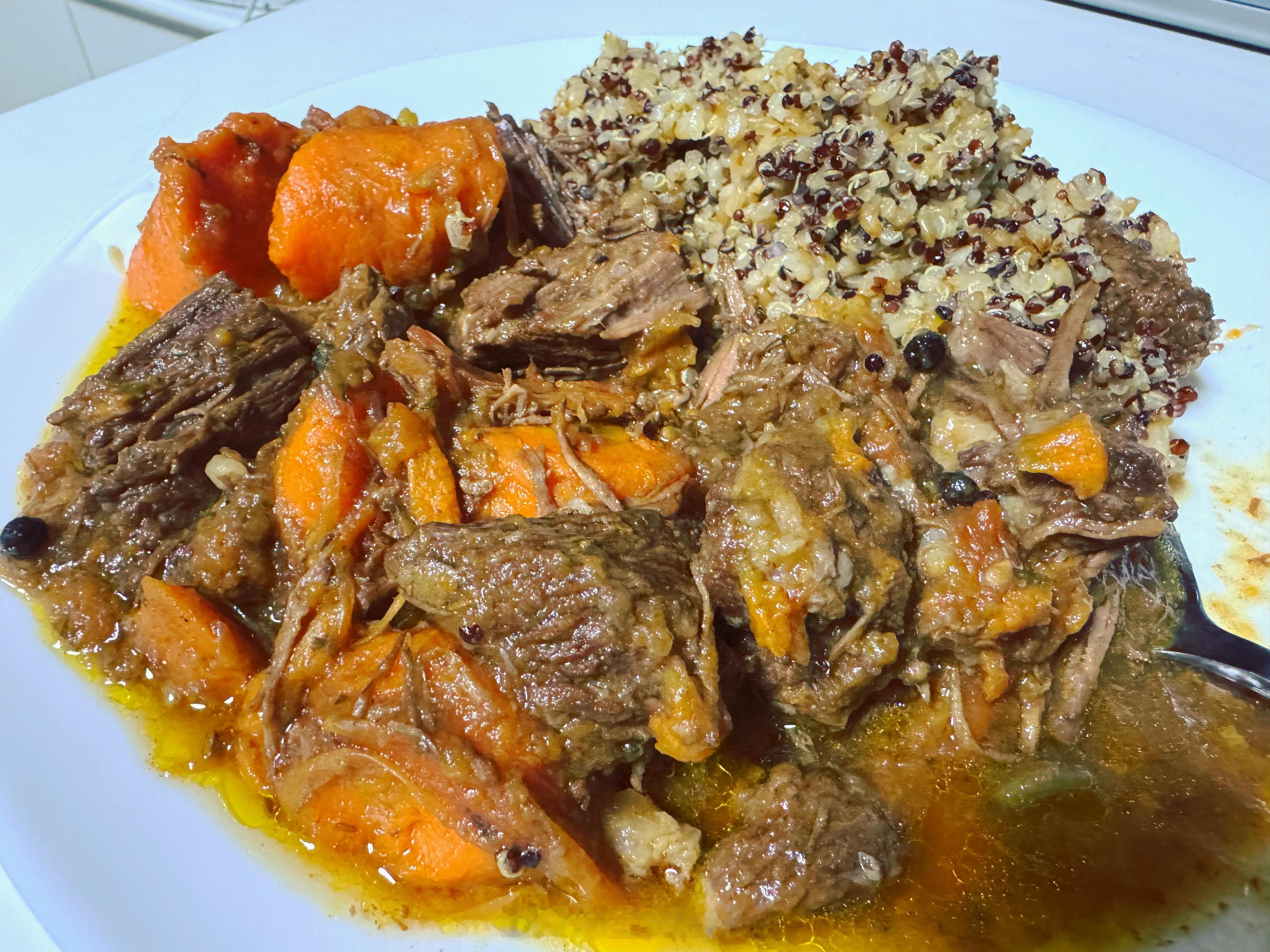 在新西兰路边吃了一个慢煮牛肉,回来颇为想念,以前做过红酒牛腩就改良了一下。配料很简单,番茄胡萝卜洋葱,和香料,重点是要炖五个小时,从一锅汤炖成一锅酱。配上藜麦糙米饭很棒,而且其实还很低卡,是一道减肥餐。