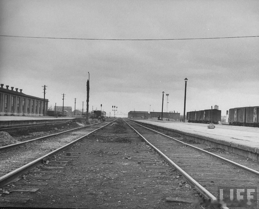 1946年,沈阳。苏联人刚刚撤走的情景,枕木全部被苏联人挖走,以致铁路无法正常运行,火车站内一片萧条,闲置的车皮。