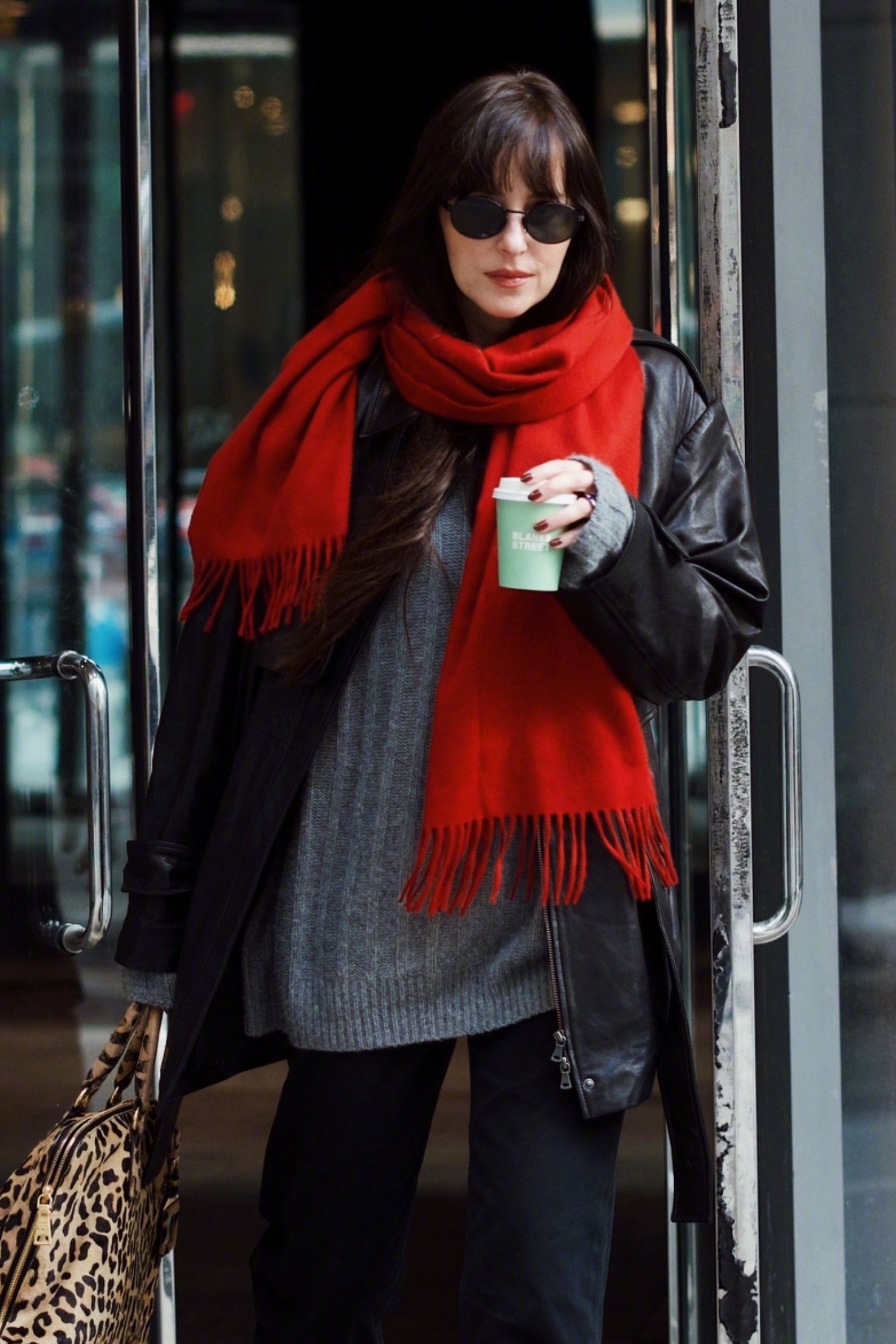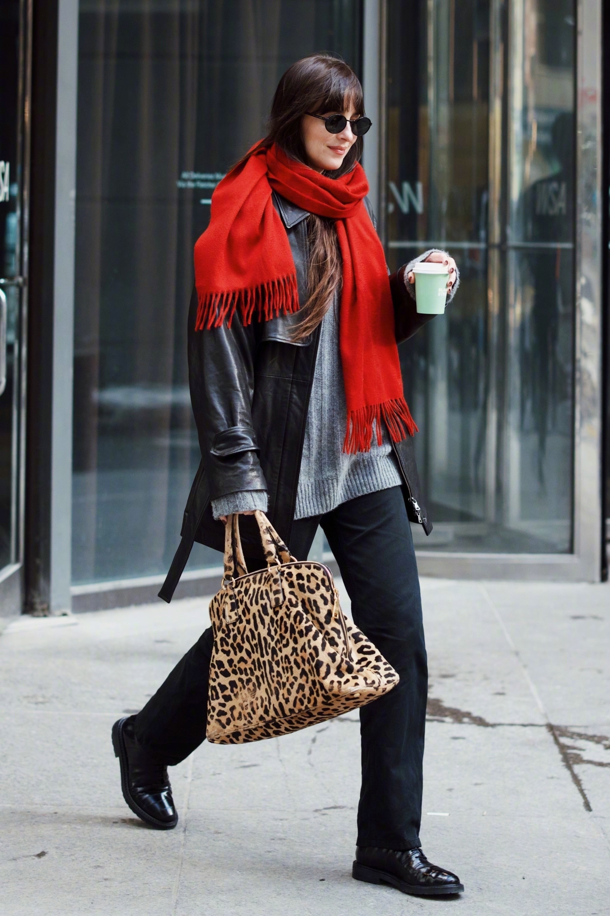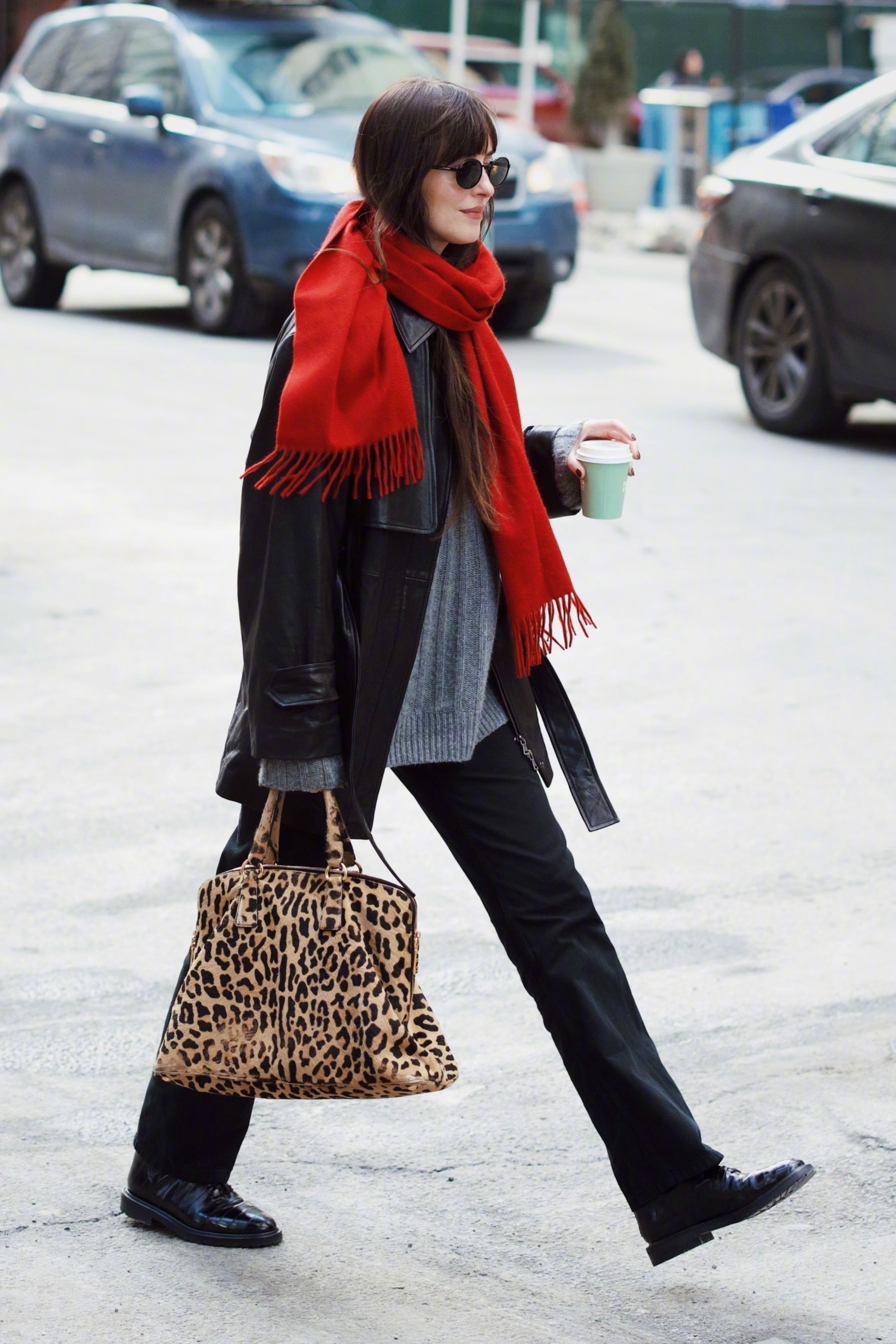 达妹Dakota Johnson纽约外出的街拍。灰、黑、红🧣配搭的一身很有新年氛围的style,手拎 Vintage Prada豹纹手袋做点缀。身穿Nour Hammour 黑色皮衣和Khaite 灰色毛衣,脚穿Legres 拼接鳗鱼踝靴,佩戴Prada太阳镜和The Row 围巾,米拉服饰解析