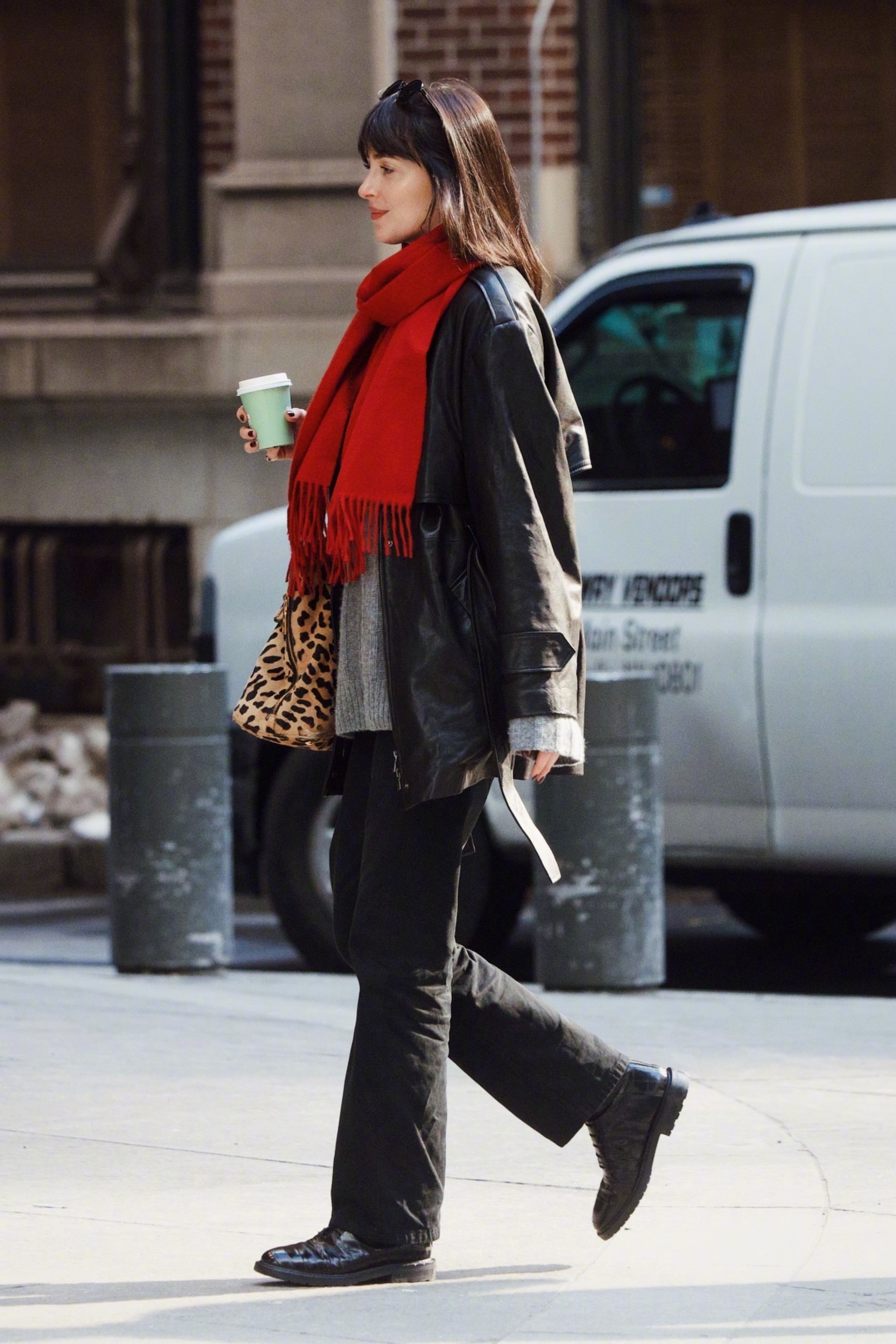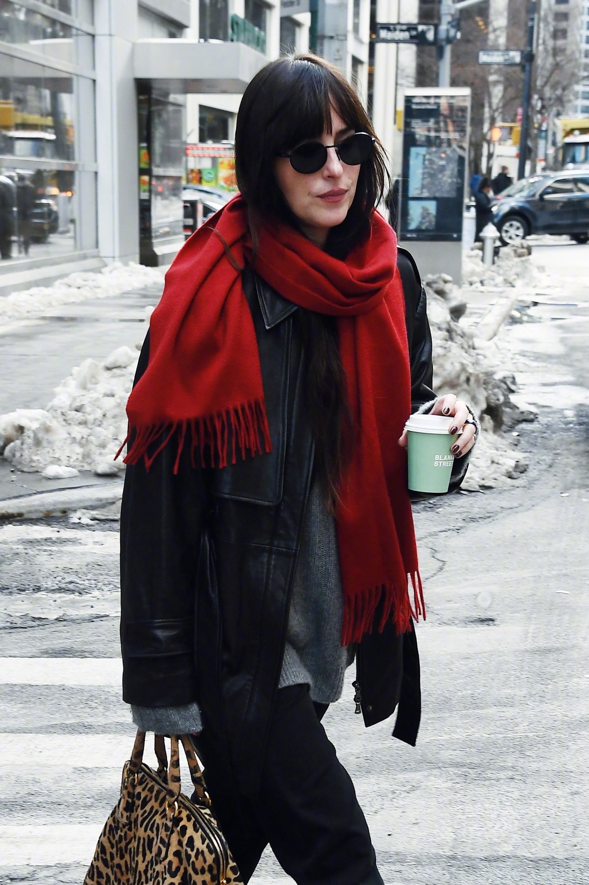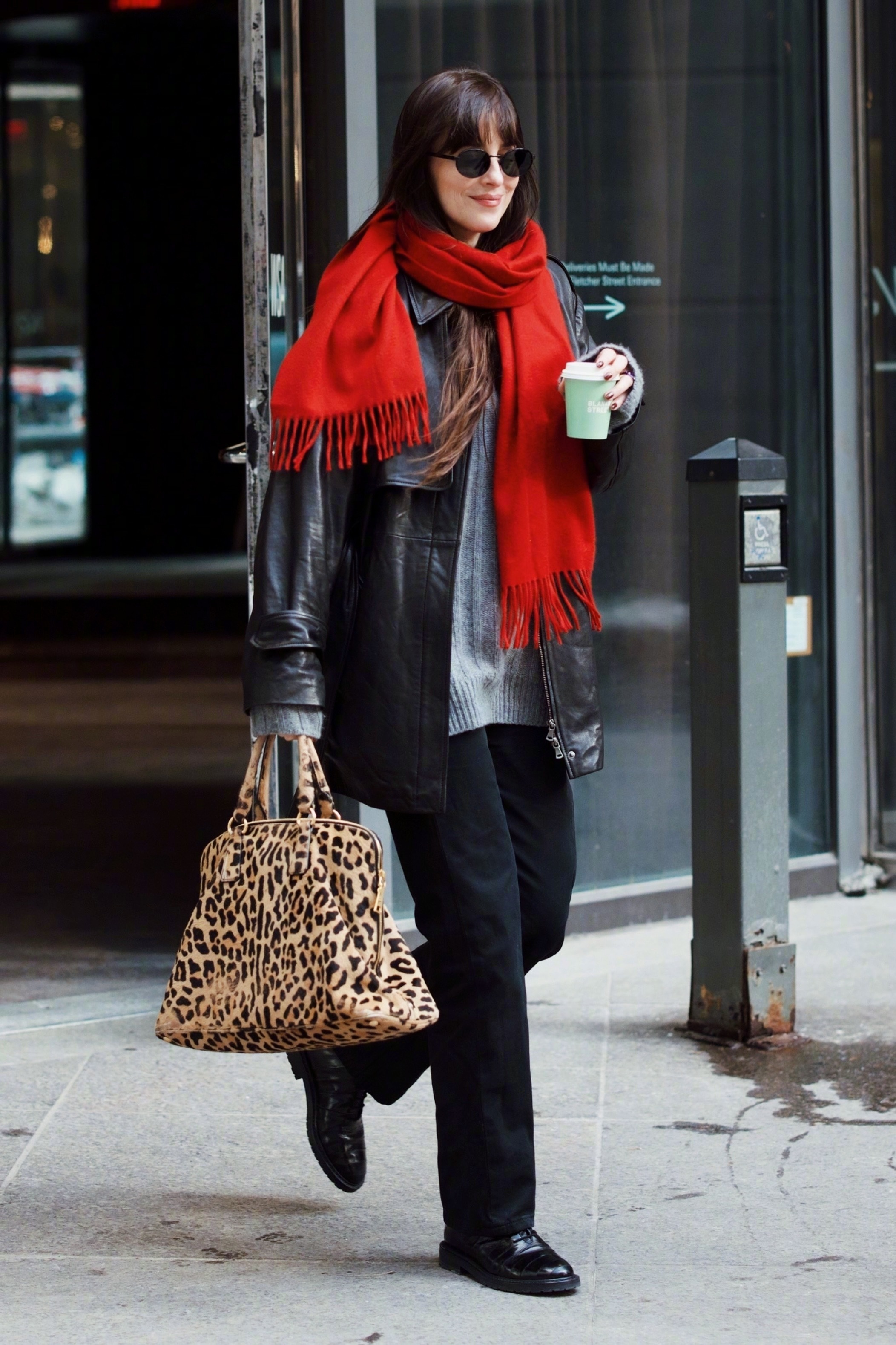 达妹Dakota Johnson纽约外出的街拍。灰、黑、红🧣配搭的一身很有新年氛围的style,手拎 Vintage Prada豹纹手袋做点缀。身穿Nour Hammour 黑色皮衣和Khaite 灰色毛衣,脚穿Legres 拼接鳗鱼踝靴,佩戴Prada太阳镜和The Row 围巾,米拉服饰解析