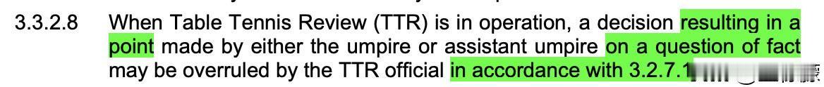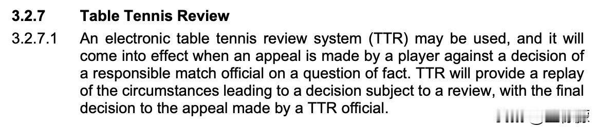 2026ITTF手册更新丨TTR变更内容 【奥运会强制使用TTR】 奥运会强制使用TTR技术。奥运会组委会应通过国际乒联认可的供应商提供该技术。 世锦赛、单打/混团世界杯、世青赛组委会应承担TTR实施的费用,且TTR供应商须经国际乒联批准。 【TTR回放官员】 当乒乓球回放系统(TTR)启用时,主裁判或助理裁判就事实问题作出的判罚,可由TTR官员根据3.2.7.1推翻。 2025wtt WTT规则争议 WTT赛制修改 WTT公平性 WTT规则调整 WTT赛事规则