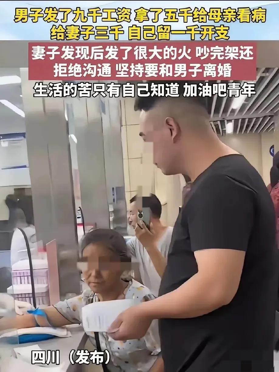 “男儿有泪不轻弹,只是未到伤心处!”四川,一男子发了9000块钱工资,刚好母亲生病,然后他在未与妻子沟通的情况下转了5000给母亲去治病,因为他觉得父母生病做儿子的给钱治病很正常,就算妻子知道了能理解,所以就先斩后奏了。给妻子3000家用,自己只留1000生活费,妻子得知后勃然大怒,直接闹离婚。 视频里的男子对着镜头,声音都有点发颤。他说自己那天发了工资,刚巧妈打电话说住院费还差一截,他没多想就转了5000过去。他还掰着手指头算,给老婆留了3000当家用,自己留1000省着点花,怎么也够撑到下个月发薪。他以为老婆会体谅,毕竟那是自己亲妈,治病救命的事,哪能耽搁? 可他忘了,婚姻里的钱从来不是一个人的事。当妻子看到转账记录的那一刻,积攒了很久的委屈一下子就炸了。她不是心疼那5000块,是气丈夫从来没把她当成这个家的主人。房贷要还,孩子的奶粉钱要备着,下个月的车险还没着落,这些压力她每天都在扛,可丈夫做这么大的决定,连一句商量的话都没有。她觉得自己像个外人,在这个家里连知情权都没有,更别说话语权了。 吵到最后,妻子把手机摔在地上,说这日子没法过了,要离婚。男子蹲在地上,看着散落的手机零件,又想起病床上的母亲,眼泪终于忍不住掉了下来。他不明白,自己只是想做个孝顺的儿子,怎么就把家给作散了? 其实,这件事里没有谁是绝对的坏人。男子的孝心没错,可他错在把“我以为”当成了“你应该”,忽略了婚姻里最基本的尊重。夫妻共同财产,每一笔大额支出都该有商有量,哪怕是给父母治病,也该提前和另一半沟通,而不是先斩后奏。妻子的愤怒也不是无理取闹,她气的不是钱,是丈夫的独断专行,是自己在这段关系里的不被重视。 我们总说,百善孝为先,但孝从来不是愚孝,更不是以牺牲自己的小家庭为代价。婚姻是两个人的修行,需要彼此尊重、彼此体谅。如果男子能在转账前和妻子好好沟通,告诉她母亲的病情,和她一起商量怎么分摊费用,或许结果就会不一样。如果妻子能多理解一点男子作为儿子的难处,坐下来和他好好谈谈自己的顾虑,而不是直接用离婚来威胁,或许这段婚姻还有挽回的余地。 各位读者你们怎么看?欢迎在评论区讨论。