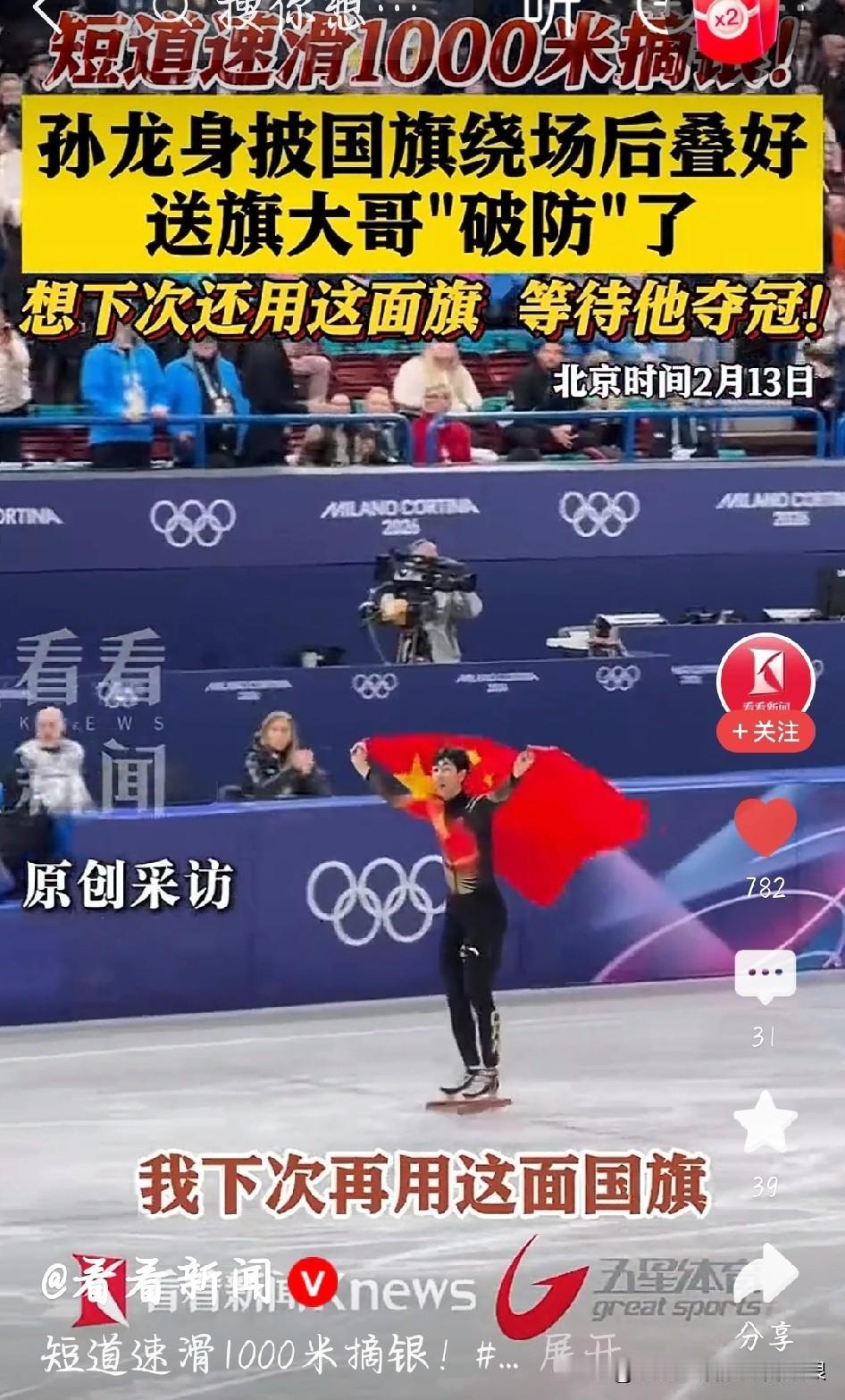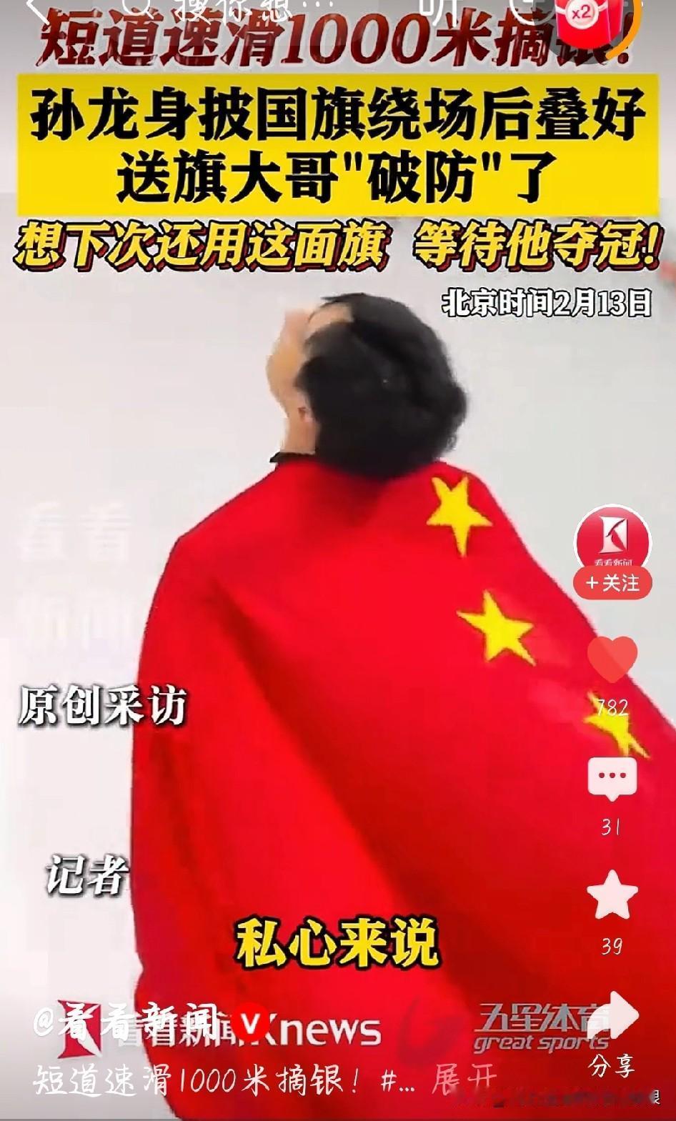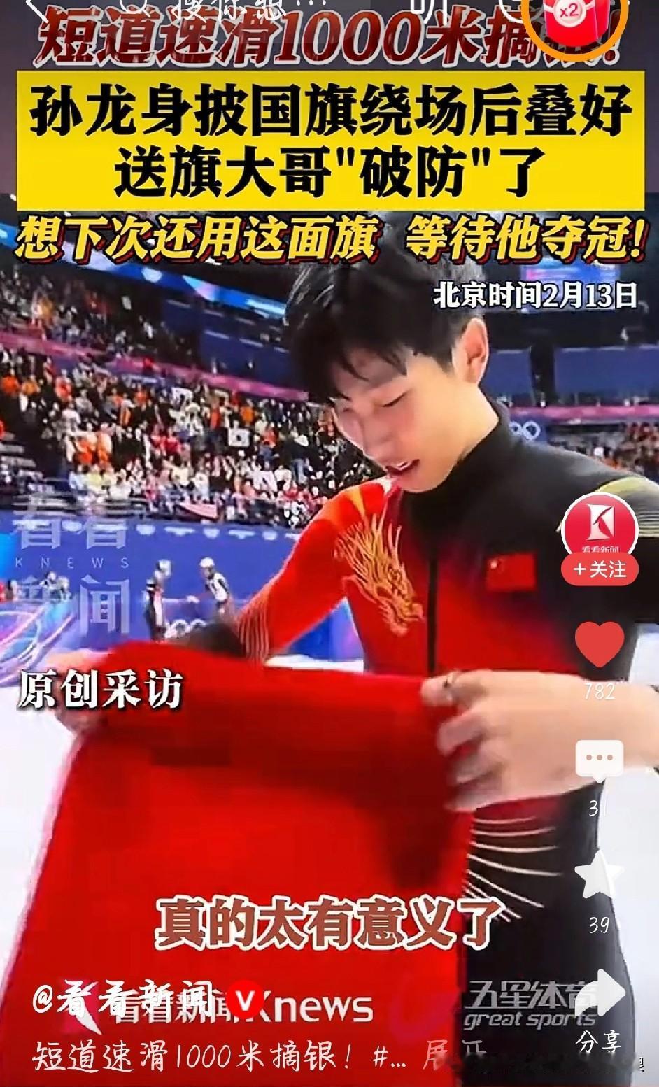 孙龙一个动作,圈粉全网! 米兰冬奥会,孙龙拿下银牌,身披国旗绕场庆祝。最戳人的不是奖牌,是庆祝完他蹲下身,把国旗仔仔细细叠得方方正正,再郑重收好。 没有华丽表演,就是最朴素的尊重。他说,身披国旗是荣耀,叠好它是基本礼节。一句话,干净又真诚。 比起夸张庆祝,这份刻在骨子里的敬畏更动人。爱国从不是口号,藏在细节里,落在行动上。孙龙好样的,这才是中国运动员该有的样子! 孙龙身披国旗绕场后仔细叠好, 孙龙