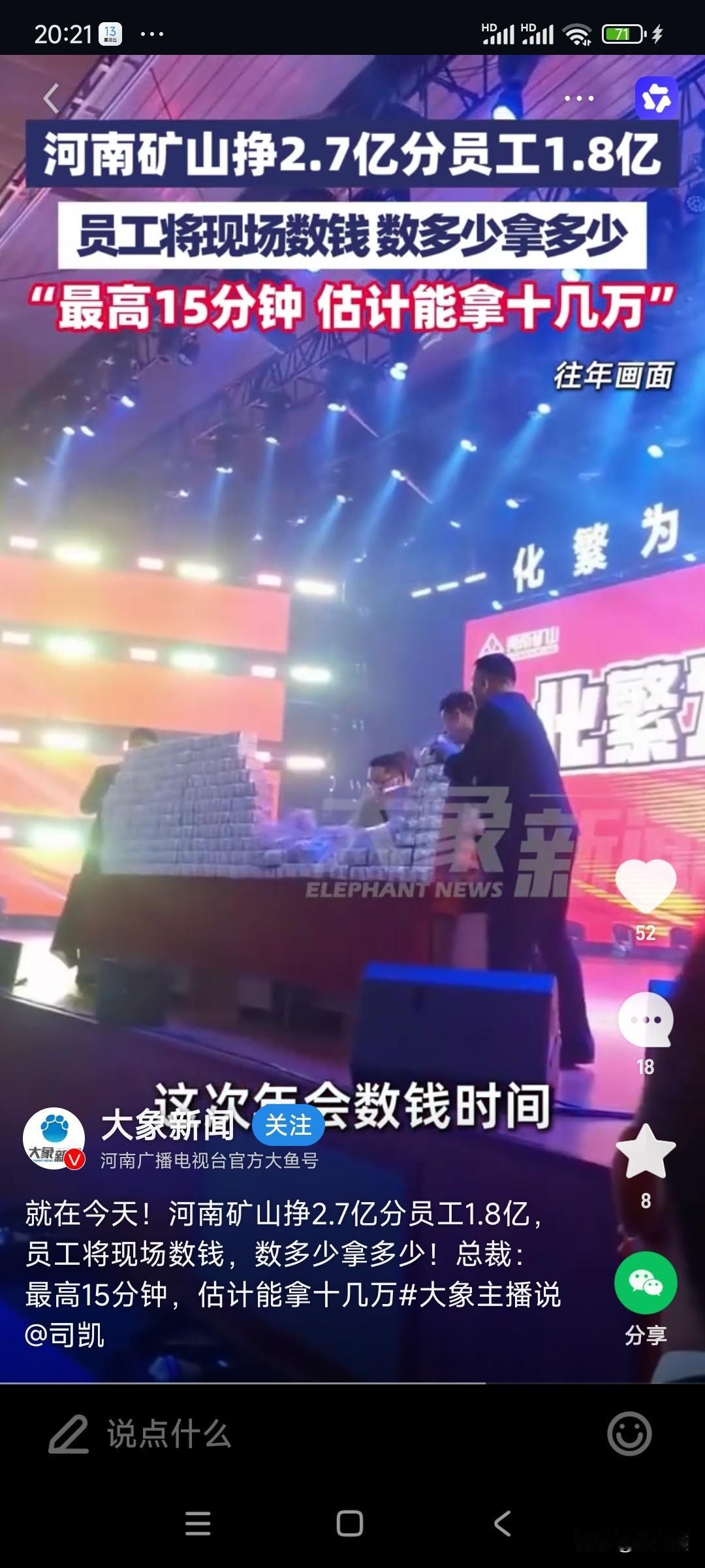 2.7亿利润分1.8亿!河南这位老板,把“打工人”宠成了合伙人 数钱数到手抽筋,这次不是段子,是真事! 河南矿山集团年会现场,6000万现金堆成“钱山”,员工上台限时数钱,数多少拿多少!15分钟,有人数了十几万,手在抖,心在跳,台下掌声雷动。这不是综艺,是7000名员工和家属的年度狂欢。 更硬核的是,公司2025年利润2.7亿元,拿出1.8亿元发奖,占比近七成。老板崔培军说:“年轻人背着车贷房贷,不容易,能帮一点是一点。”这话比任何鸡汤都实在。 这已不是他第一次“豪横”。2024年,利润2.6亿,发了1.7亿;平时,带薪收麦假、孝亲金、父母免费游……福利从不缺席。他坚持“不贷款、不融资、不拖欠”,把利润几乎全分给员工。 在制造业普遍承压的当下,这种“挣一块分八毛”的魄力,不仅暖了员工的心,更给所有企业上了一课:真正的共富,不是画饼,是真金白银的共享。