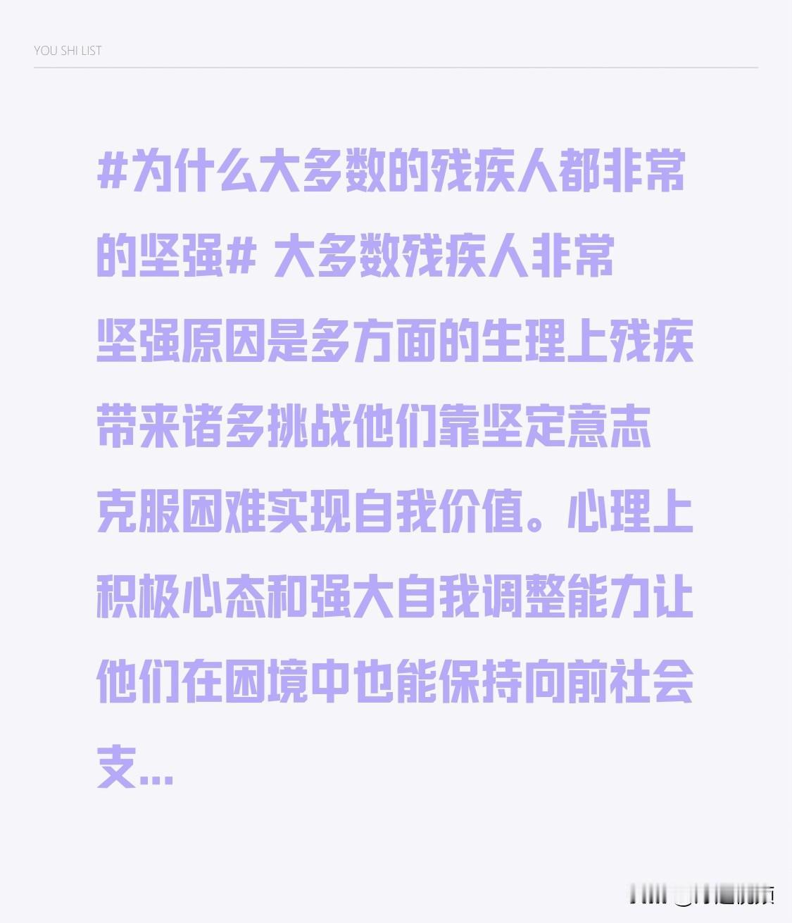 大多数残疾人非常坚强,原因是多方面的。生理上,残疾带来诸多挑战,他们靠坚定意志克服困难,实现自我价值。心理上,积极心态和强大自我调整能力,让他们在困境中也能保持向前。 社会支持也至关重要,家庭、朋友和社会给予他们勇气与希望。像残疾夫妻,丈夫为家送外卖,妻子默默守候,爱让他们在逆境中坚守。同时,个人努力也不可忽视,他们不断学习适应,提升技能能力。还有榜样的激励,那些身残志坚者的事迹鼓舞着更多人。残疾人的坚强值得我们尊重与学习。