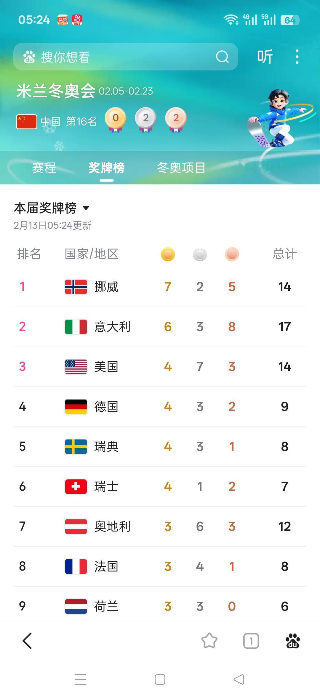 截止北京时间2月13日凌晨5:28分,意大利,意大利🇮🇹米兰冬奥会最新奖牌榜如下,中国代表团以2银2铜位列第十六位,新增添的一枚银牌是孙龙在短道速滑男子1000米决赛中以1分24秒565获得银牌。 孙龙这块银牌拿得不容易。短道速滑场跟打架似的,韩国加拿大那几个老油条挤来撞去,孙龙硬是从夹缝里杀出血路。最后冲刺那几下,眼瞅着要被韩国选手超了,他咬牙把身子往前一探,冰刀尖险险压线。1分24秒565,就比金牌慢半个冰刀的距离。 咱们这次冬奥开局有点慢热。往常这时候早该见金了,现在榜单上还是一片银色铜色。花样滑冰那对双人滑失误太可惜,自由滑最后一个托举晃了下,总分直接掉到第四。冰壶队也是,混双输给瑞士那场看得憋屈,最后一壶就差一毫米进营。 但话说回来,奖牌成色不能光看颜色。孙龙这块银牌含金量足得很,对手是上届冠军和世界纪录保持者。小将第一次参加冬奥,顶着压力滑出个人最好成绩,这心理素质比奖牌颜色金贵。教练组赛后抱着他直拍背,眼圈都红了。 现在压力全在谷爱凌身上。这姑娘今天下午坡面障碍资格赛,全中国观众都盯着呢。上届北京她拿了两金一银,这次米兰媒体追着她拍,训练场外头长枪短炮围了三层。希望别被包袱压垮,正常发挥就成。 韩国队现在奖牌榜排第一,四块金牌晃眼睛。他们短道速滑确实狠,男队女队都跟开了挂似的。咱们得加把劲,后面还有自由式滑雪空中技巧、速度滑冰几个强项。王强那帮老将该站出来扛旗了。 冰球那边更愁人。女队输给捷克八个球,门将被射成筛子。男队对上加拿大,三节比赛没摸几次球。冰球这项目咱们底子薄,跟欧美强队差着几十年功底。能站上冬奥赛场已经算突破,奖牌暂时别想了。 各位读者你们怎么看?欢迎在评论区讨论。孩子的教育最好的方式是什么 中日关系会因日本军事松绑恶化吗 米兰冬奥会 米兰短道速滑 米兰冬奥落选 短道速滑赛程 米兰看冬奥会