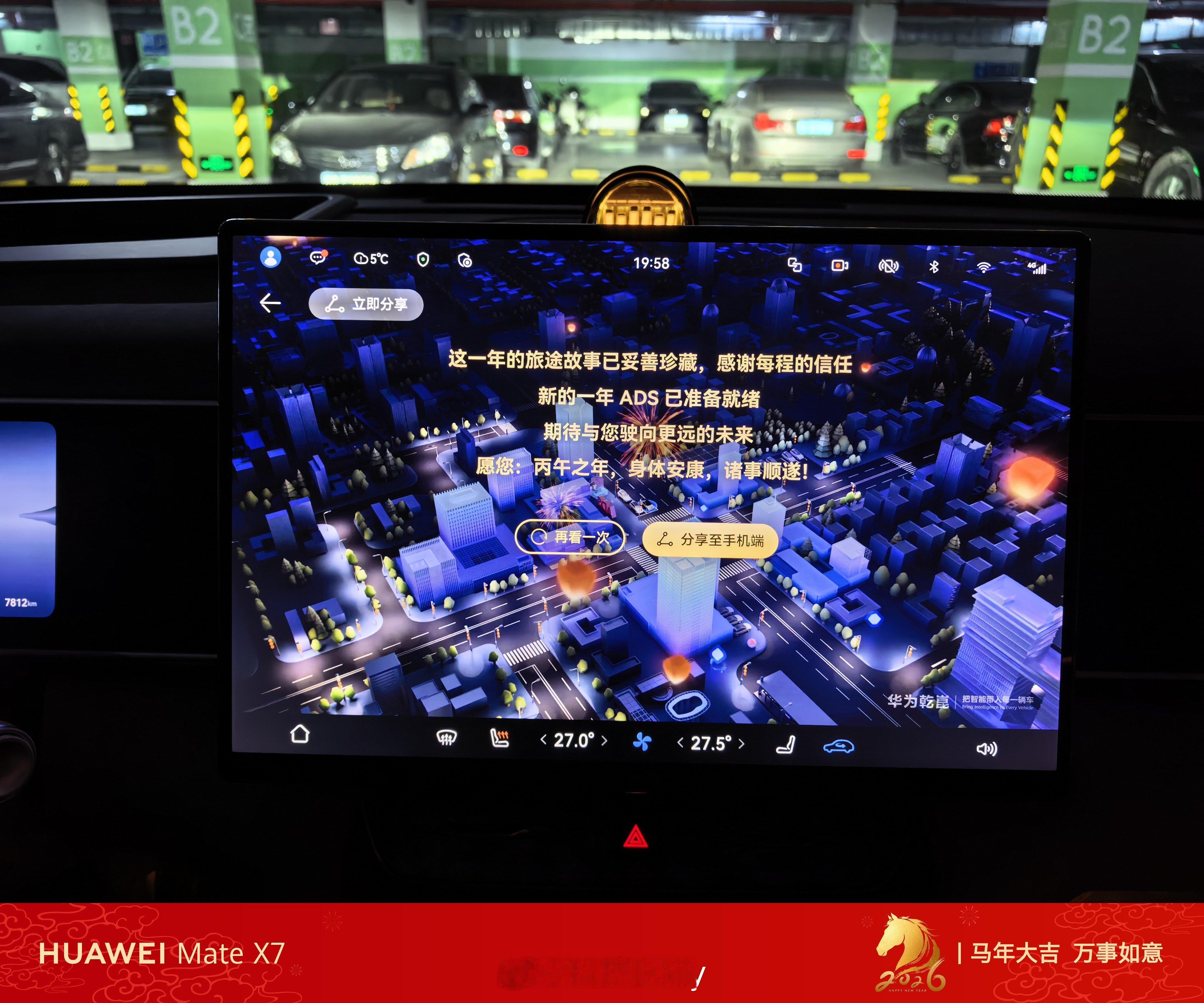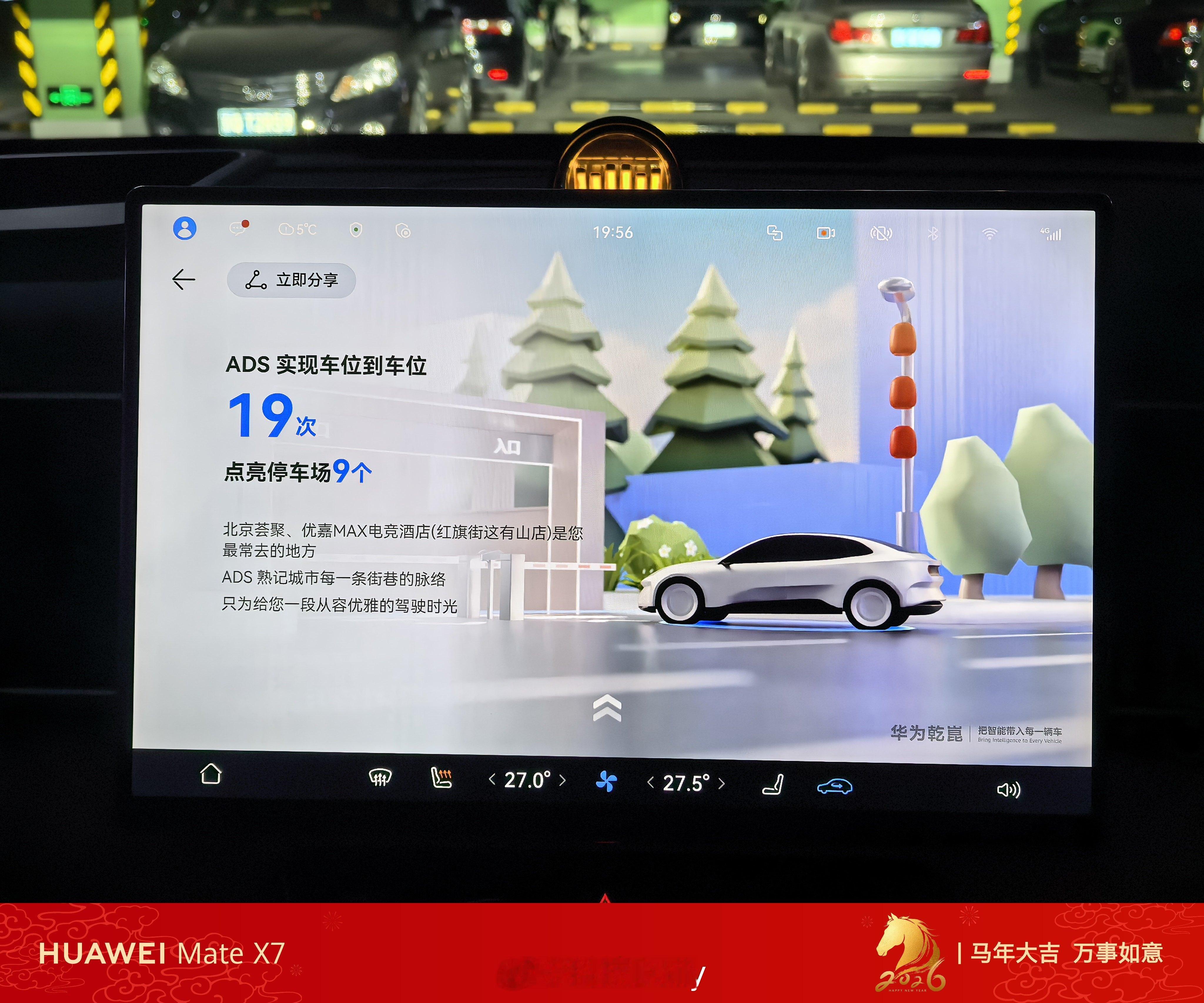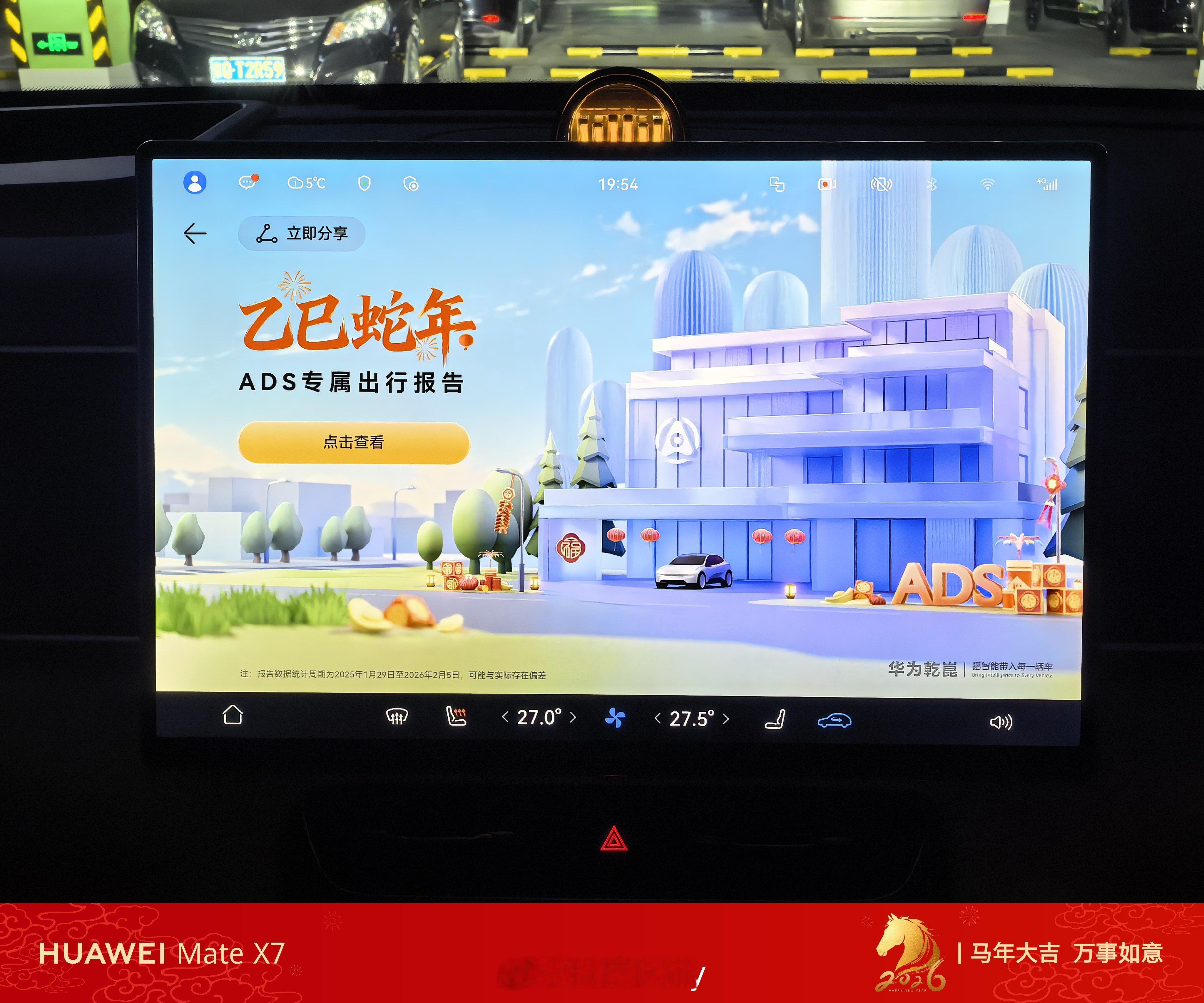 鸿蒙智行年味开始有起来了,车位变成了福字,氛围感也是拉满的,还能让车化身马,等会上路试试。我的全新问界M7也推送了ADS专属出行报告,单车统计,如果算上我全部的车,里程数会更多。