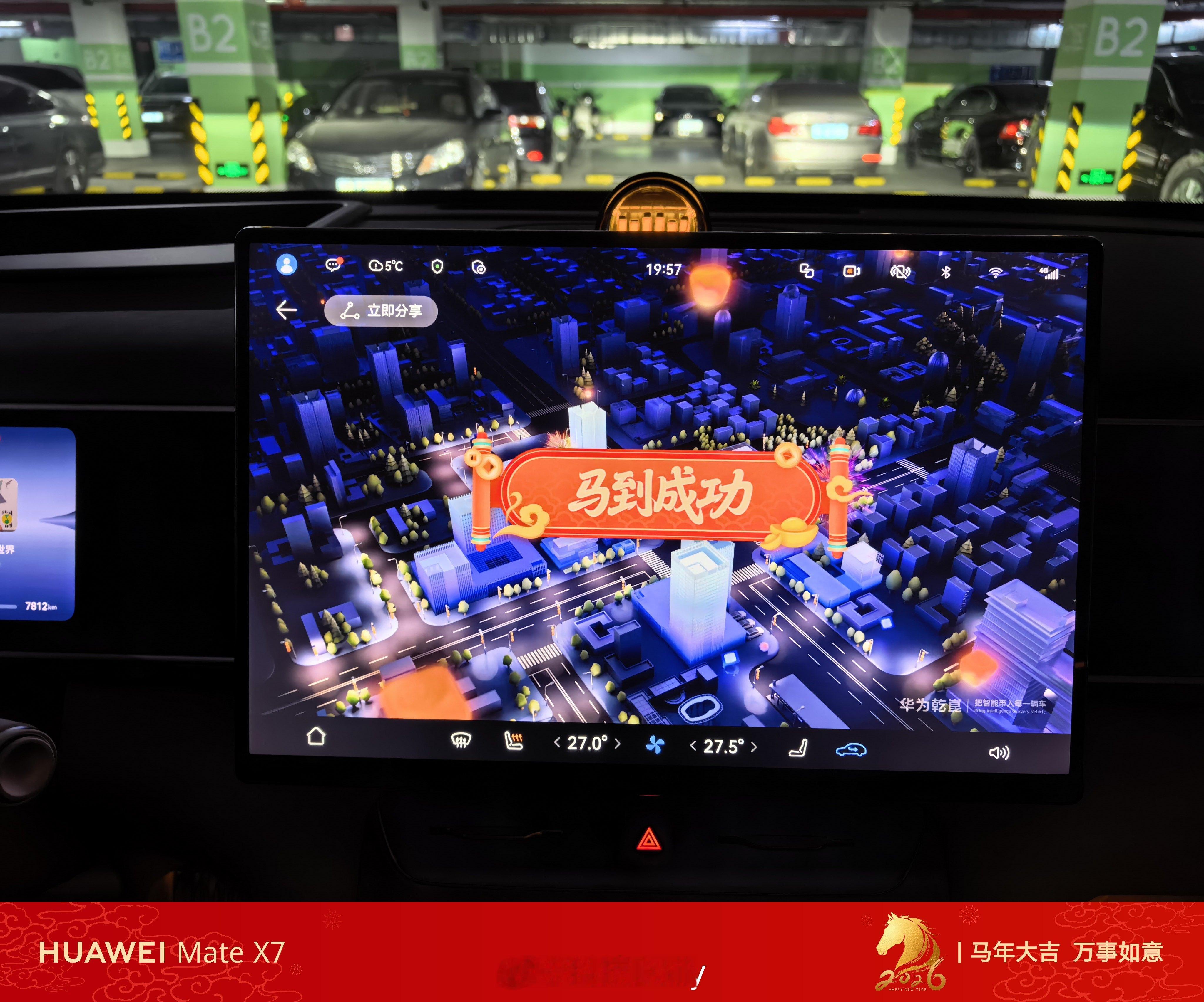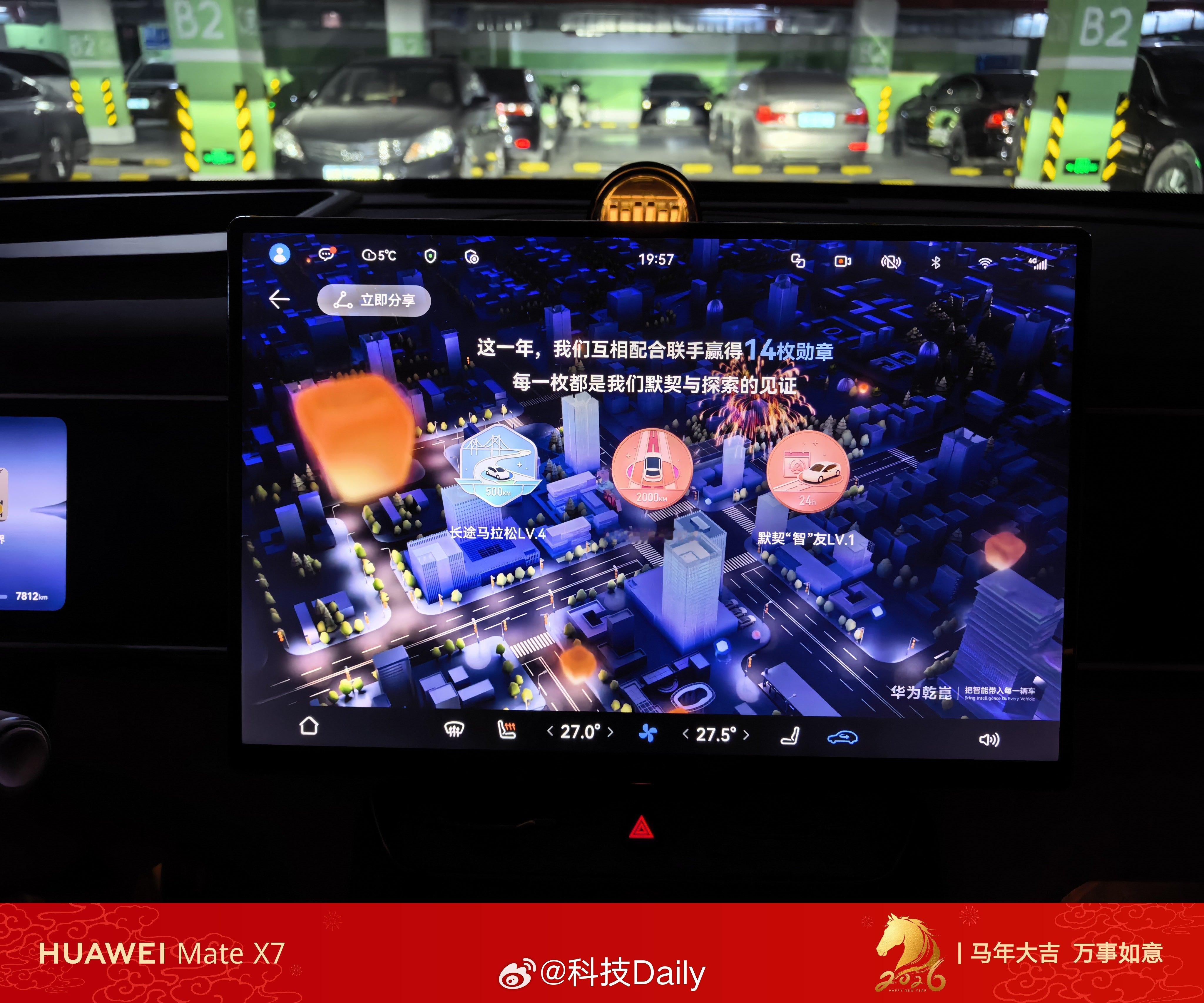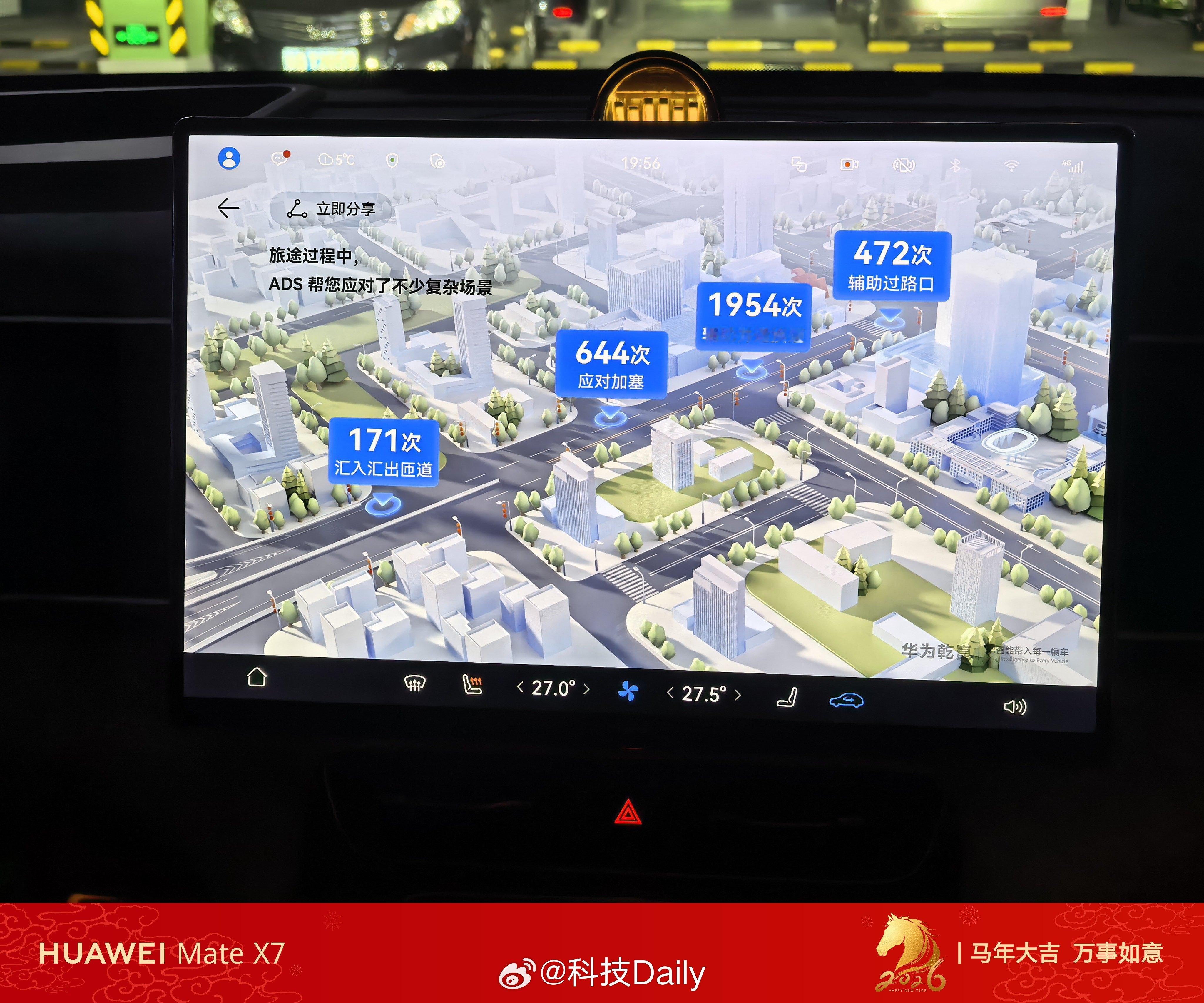 鸿蒙智行年味开始有起来了,车位变成了福字,氛围感也是拉满的,还能让车化身马,等会上路试试。我的全新问界M7也推送了ADS专属出行报告,单车统计,如果算上我全部的车,里程数会更多。
