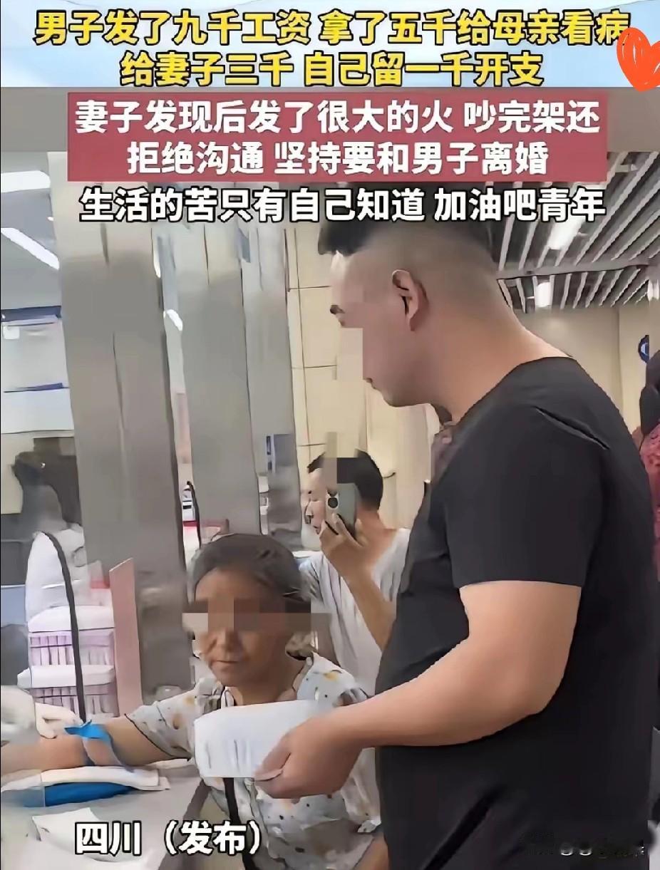 男儿有泪不轻弹,只是未到伤心处。 这两天刷到个扎心热搜:月薪9000的男人,没和老婆商量,转5000给生病的母亲治病,结果老婆查账后直接闹离婚。 底下全是骂妻子不近人情的,说“孝顺没错,离就离”。可我越看越清醒:这婚闹到这份上,真不是5000块的事! 大家都被“孝心”绑架了,却忽略了婚姻的核心——尊重。 夫妻共同财产,从来不是谁赚谁就能单方面支配。他觉得给妈治病天经地义,却跳过了“商量”这个最关键的动作。 这一跳过,传递的信号太伤人:在这个家,你只有知情权,没有决策权。 妻子要的从来不是拦着他尽孝,而是被当成“自己人”。她怕的不是这5000块,是今天能不商量转5000,明天就能不商量挪两万,她永远活在被忽视的不安里。 真的,别再拿“孝顺”当借口了。 好的婚姻,孝心从不是“先斩后奏”,而是“有商有量”。一句“老婆,妈生病了,我想转5000给她治病,你看行吗”,既尽了孝,又给了尊重。 孝顺从不是偷偷摸摸,而是有商有量。先尊重,再尽孝,这不是怂,是守住一个家的底线。别让你的孝心,伤了枕边人,更毁了辛苦经营的家。