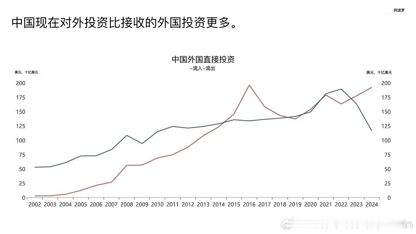 东大对外投资(红线)在2016年到达高点,然后跌了几年,2022年开始飙升,今年出海投资估计要创新高。外国对华直接投资(蓝线)在2022年到达顶峰,然后快速下降。FDI 的一升一降,也可以看到东大经济转型,和日本当年很像。宏观经济直接投资