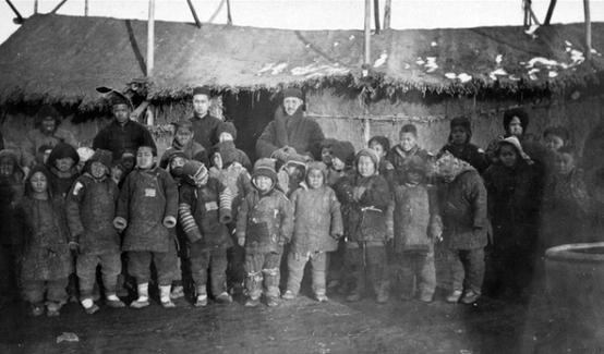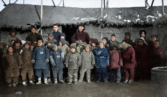 1927年至1928年,山东遭遇了百年不遇的大饥荒,水、旱、蝗灾接踵而至,全省60余县受灾,灾民超过1000万人,数百万人饿死或病死。无数家庭破碎,大量儿童沦为孤儿。 为了求生,灾民们纷纷逃往济南、青岛等大城市。在济南,齐鲁大学等机构和教会组织设立了难民营,为灾民提供食物、住所和医疗救助。照片中的济南齐鲁大学附近的难民营的孩子们穿着破旧的棉衣,在寒冬中瑟瑟发抖,他们大多是在饥荒中失去父母的孤儿,而中间的几位成年人,正是参与救助的工作人员或志愿者。