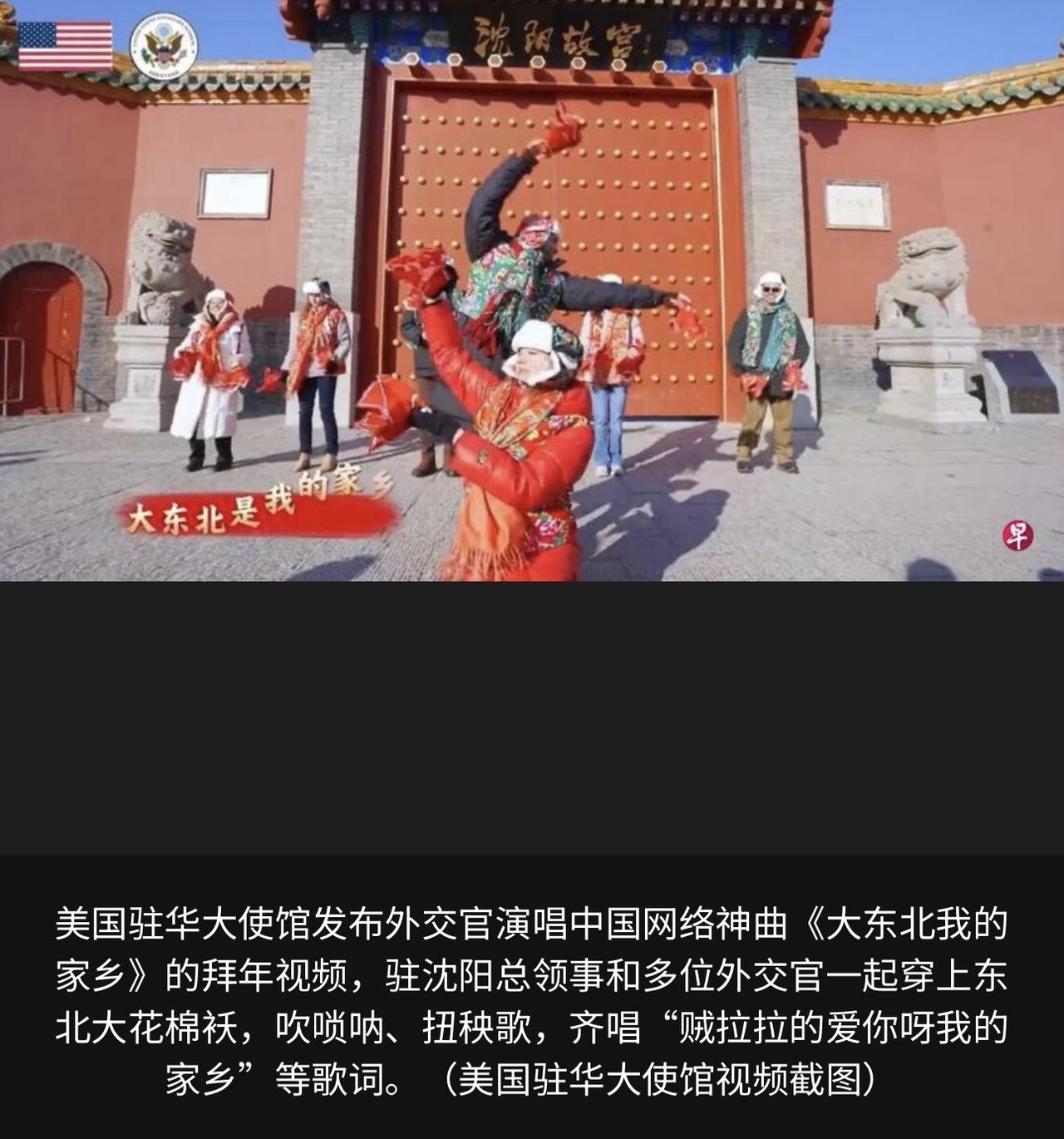 美国驻华外交官齐唱《大东北我的家乡》拜年 美国驻华大使馆在春节期间发布拜年视频,驻沈阳总领事和多位外交官穿上东北大花棉袄,在沈阳故宫外吹唢呐、扭秧歌,并齐唱中国网络神曲《大东北我的家乡》。视频中外交官们还用东北话送上新年祝福。 该视频在中国社交媒体上获得许多网民点赞,称其展现了文化自信与中美友谊。