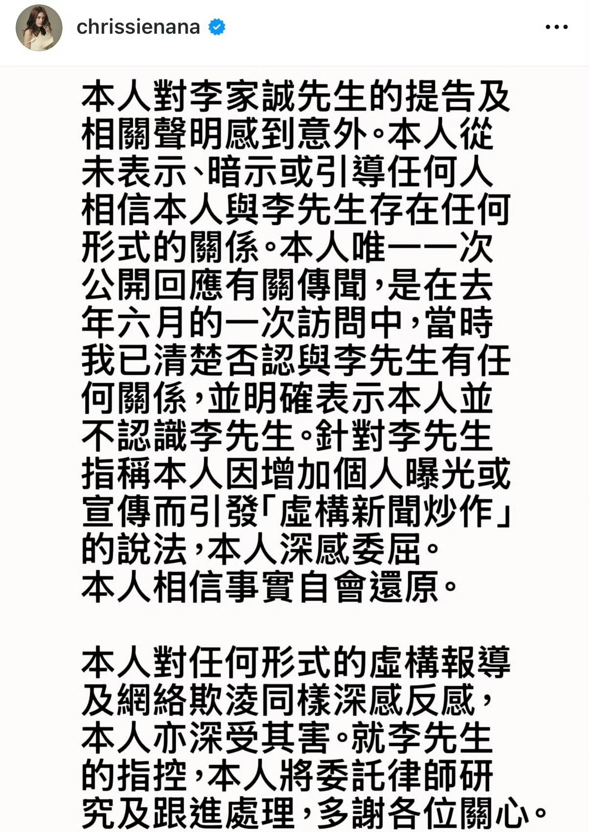 对此,周秀娜回应称,从未表示、暗示或引导任何人相信本人与李先生存在任何形式的关系,本人深感意外与委屈。