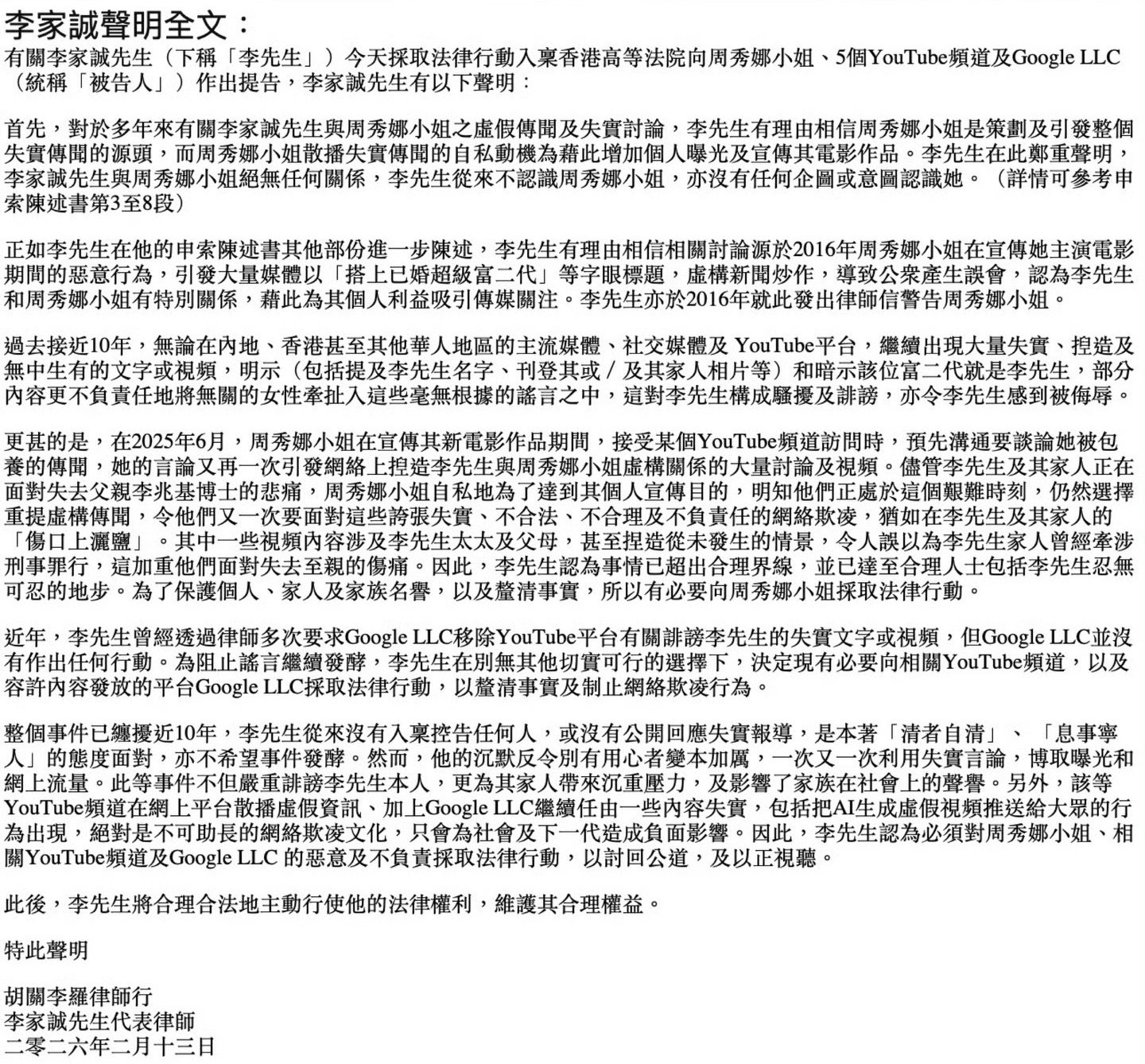 2月13日,香港恒基兆业地产集团主席李家诚控告演员周秀娜,认为其是近十年虚假传闻的“策划及引发源头”,同时控告多个自媒体账号诽谤及骚扰。李家诚强调,他与周秀娜绝无任何关系,他从来不认识周秀娜,也没有任何企图或意图认识她。李家诚告周秀娜诽谤及骚扰周秀娜回应