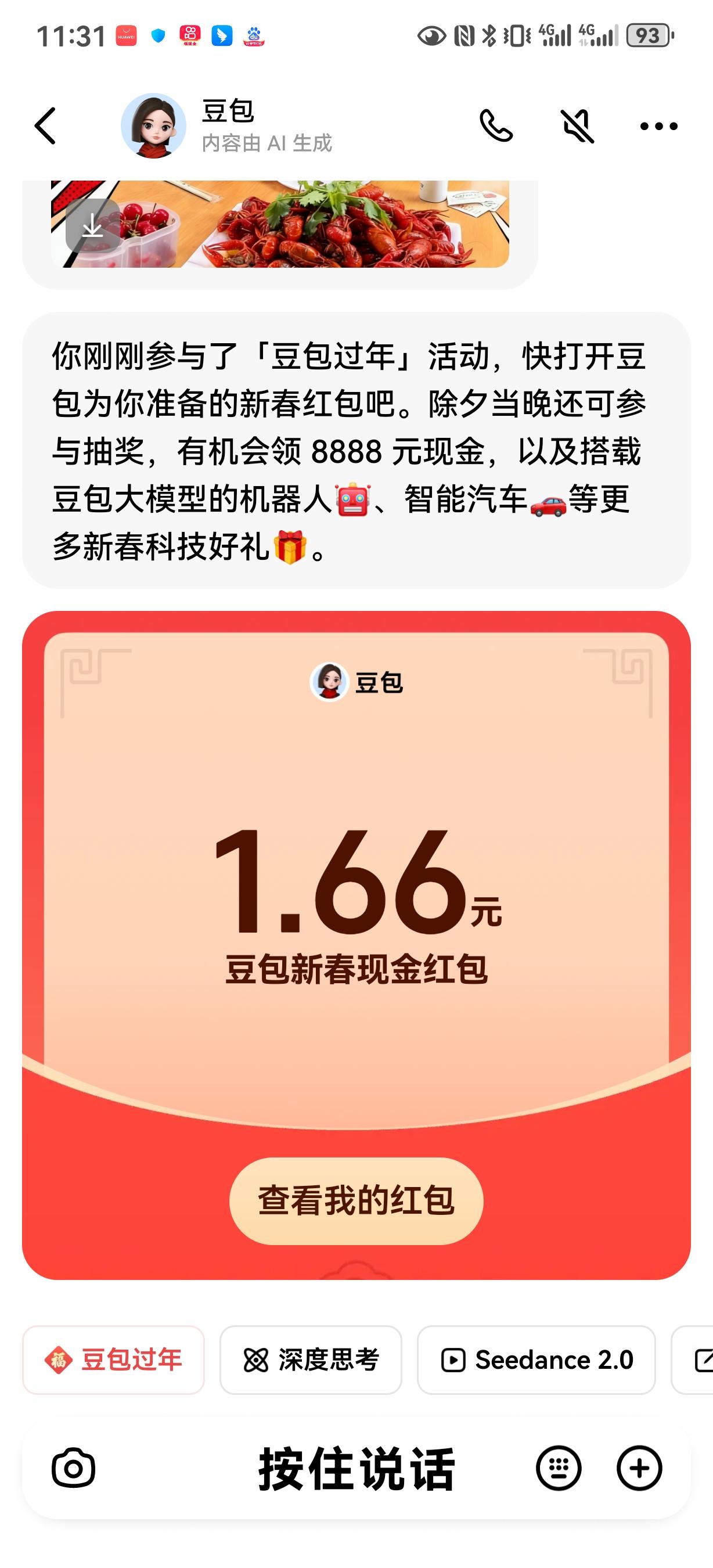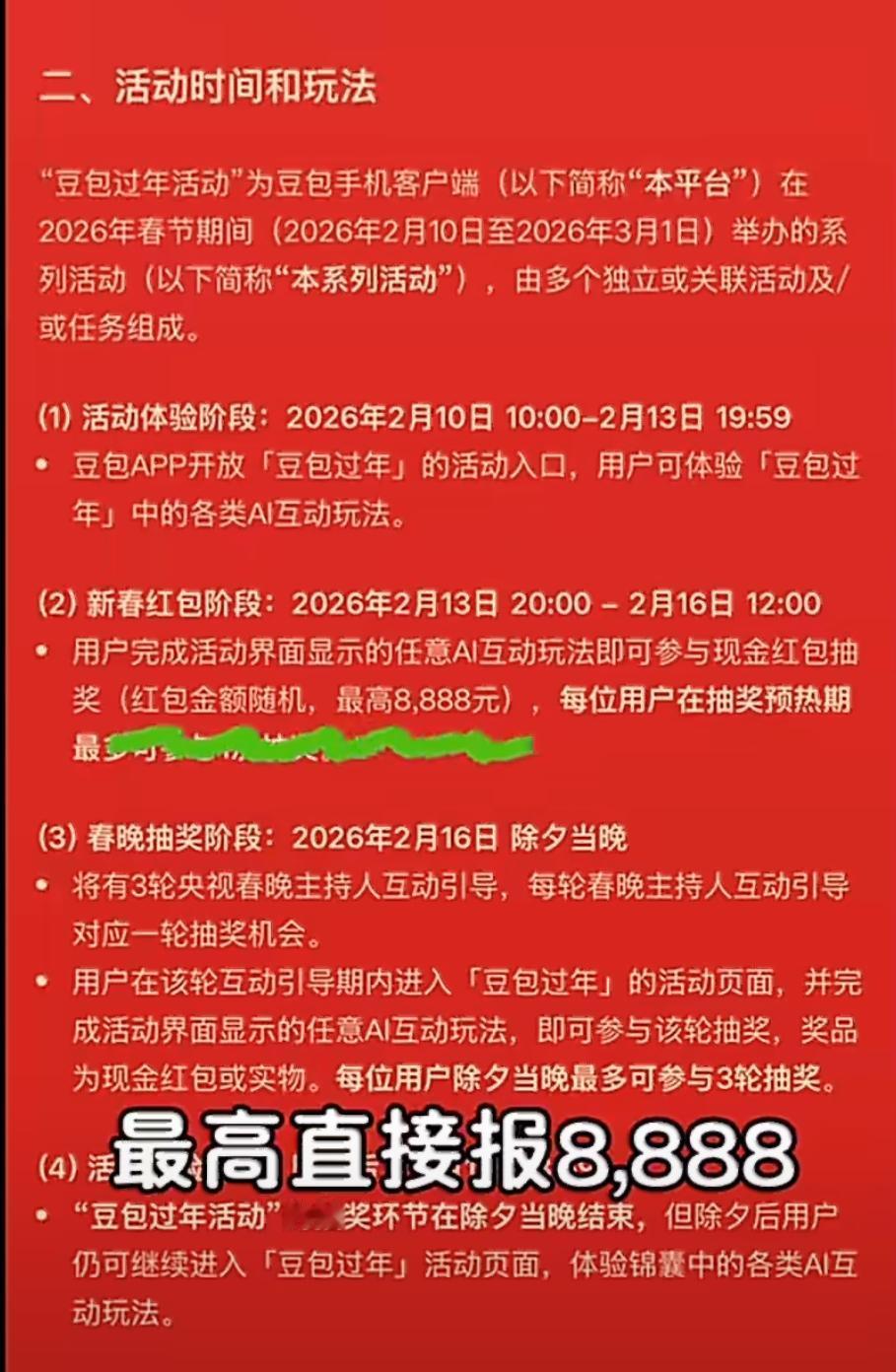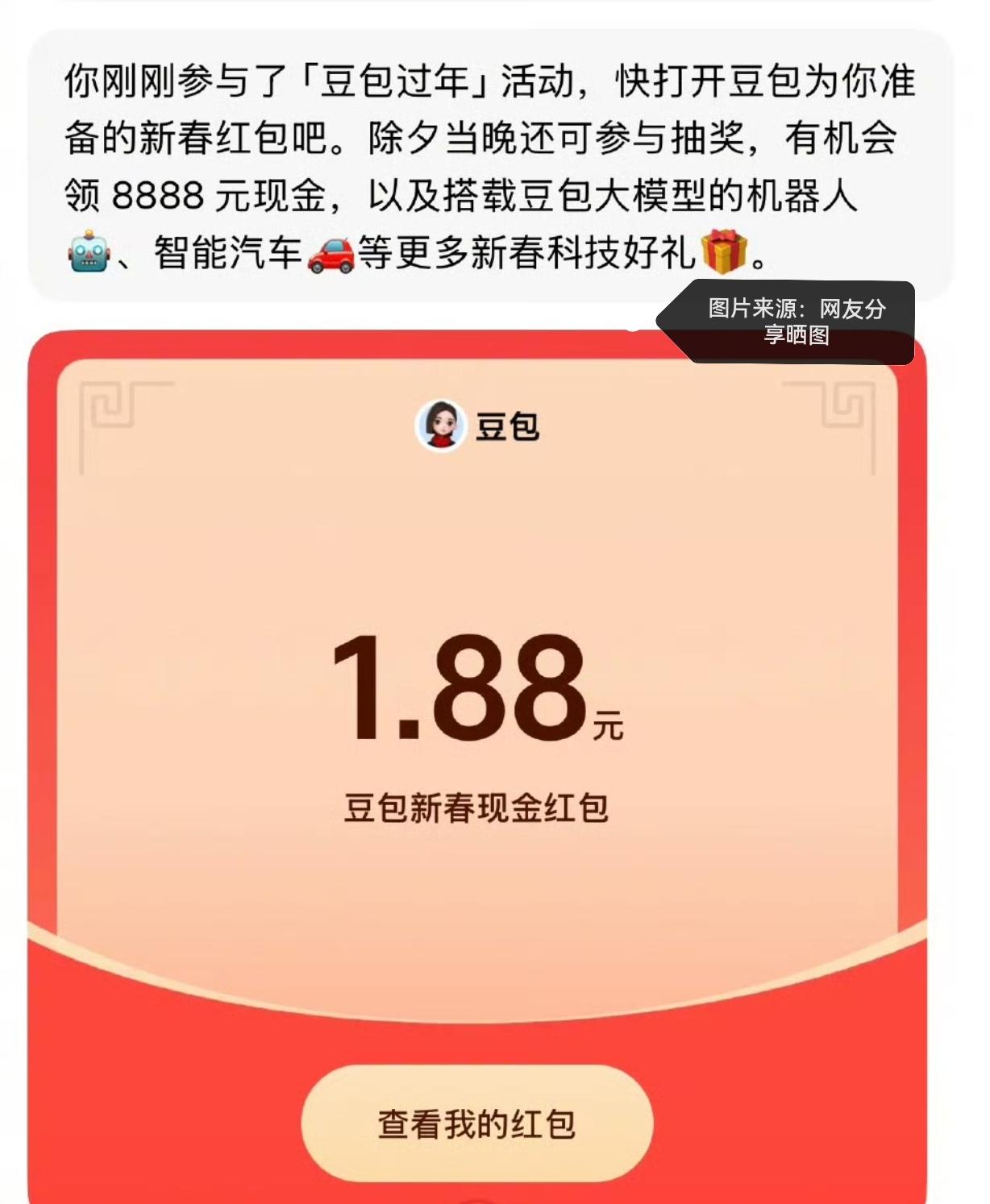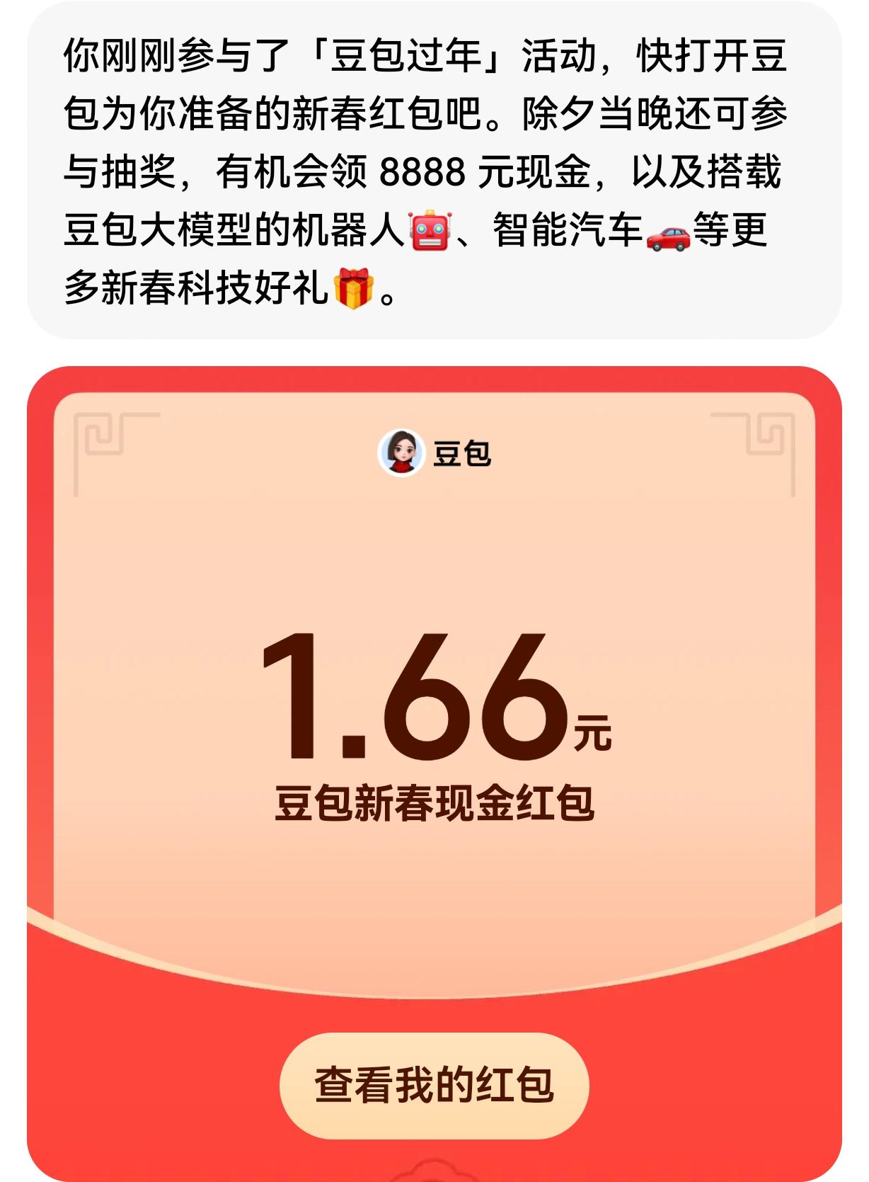 春节红包大战越来越热闹啦!继元宝、千问之后,豆包也加入战局。在豆包 APP 输入框左上方有“豆包过年”选项,2 月 13 日 20:00 能参与新春抽奖,最高可领 8888 元现金红包,人人有机会,手慢可就没了。 更让人惊喜的是,2 月 16 日除夕当晚,豆包会通过央视总台春晚送福利,超 10 万份科技好礼等你拿,还有最高 8888 元新春现金红包。奖品超丰富,从机器人到 3D 打印机,甚至还有电车使用权。这谁能忍住不参与啊,赶紧调好闹钟准备抢!