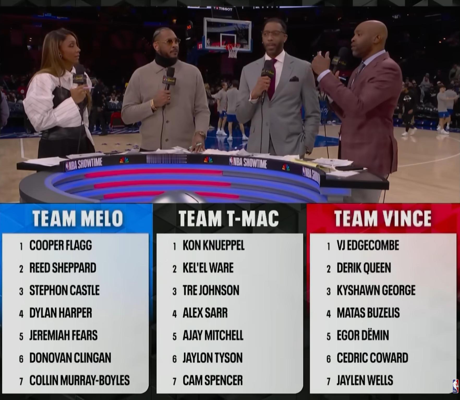 前三支队伍由NBA所有30支球队的助教们投票选出,和往年的区别是今年的新秀候选人们也不再有位置区分。在NBC电视转播中,安东尼、麦迪、卡特按照蛇形选秀的顺序,将21名球员分别组成了三支队伍,值得一提的是本次选择中的前三顺位弗拉格、克尼普尔、埃奇库姆全部来自2025届,一定程度上也体现了过去两届选秀的球员质量差距。