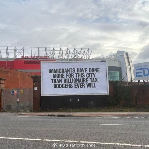 今早老特拉福德球场外被立立牌diss拉特克里夫了“移民为曼彻斯特所做的贡献比逃税的亿万富翁多得多。”