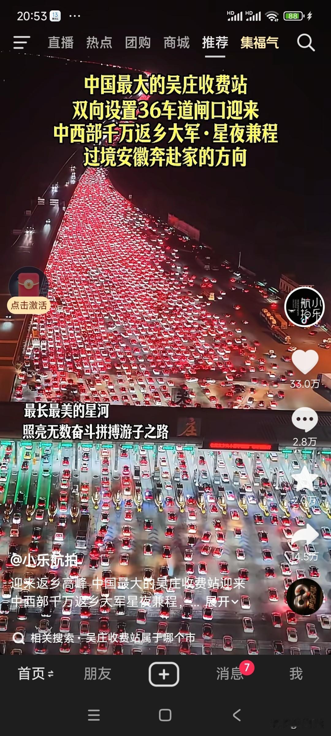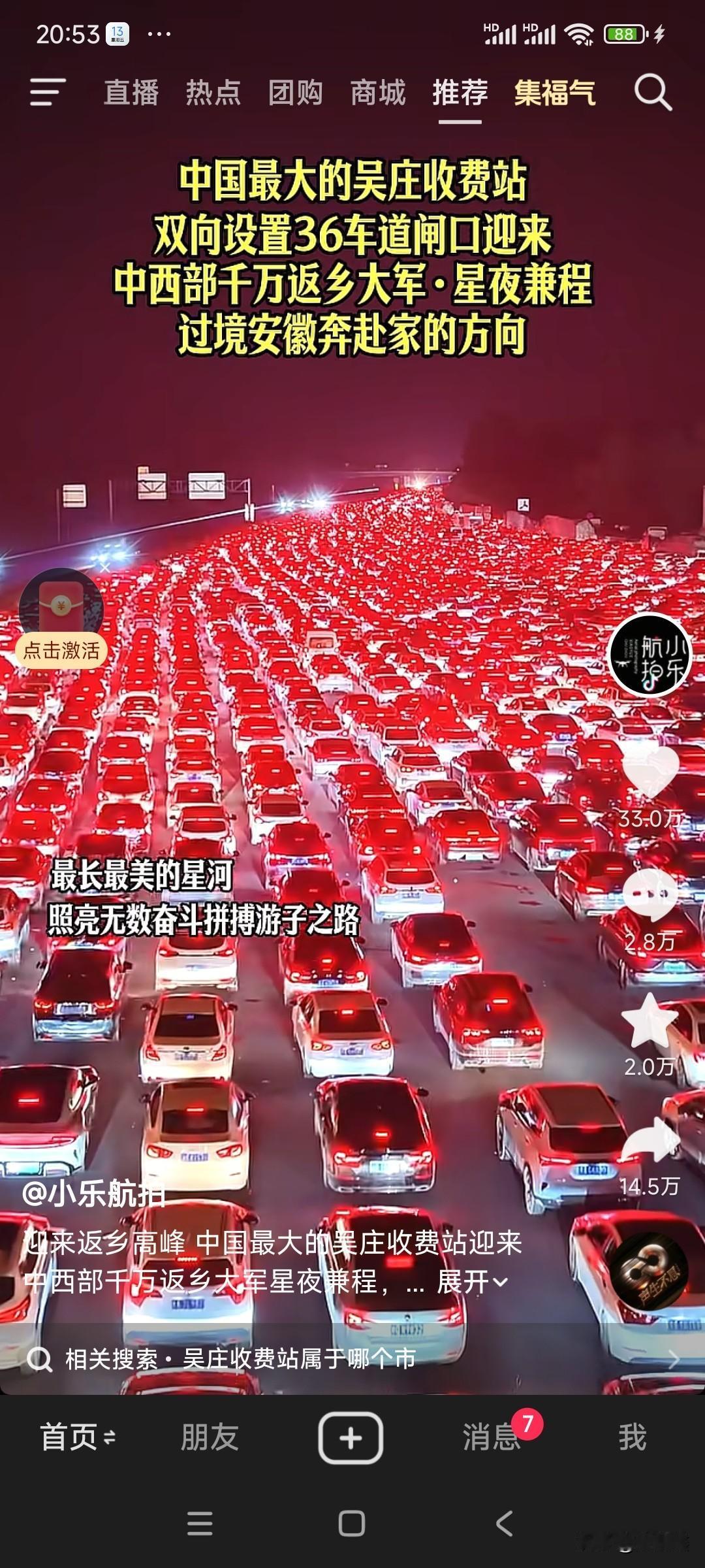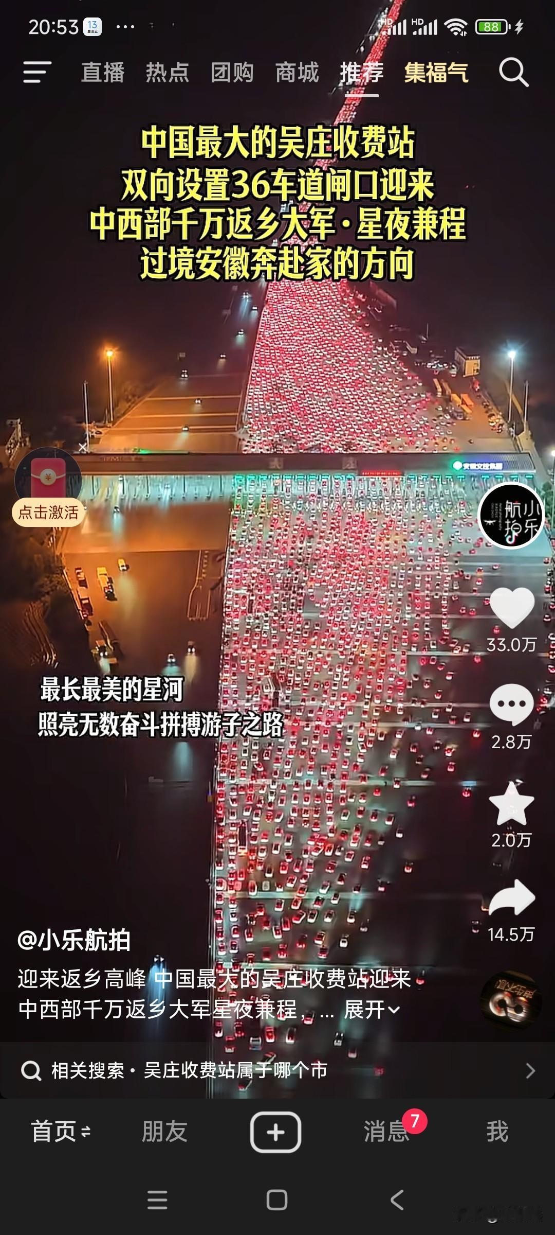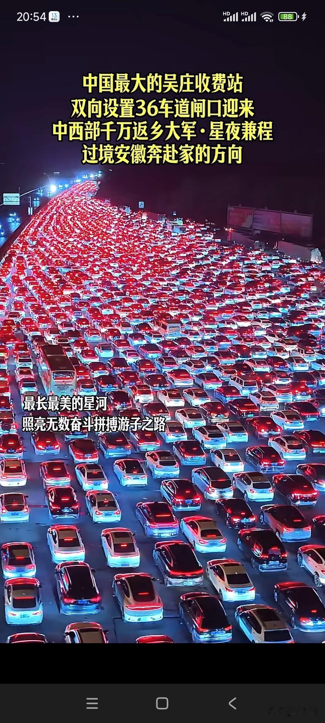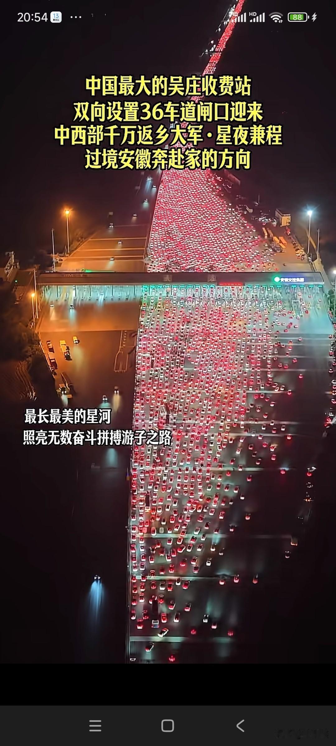 中国最大收费站迎返乡潮!36条车道汇成“星河” 星夜兼程,只为回家!春节将至,被誉为“中国最大”的吴庄收费站迎来中西部千万返乡大军。这里双向设置36个车道,此刻在夜幕下被车灯点亮,宛如一条长长的“星河”,照亮了无数游子归家的路。作为联通中西部与长三角的重要节点,吴庄收费站素有“安徽东大门”之称,春运期间车流激增,单日最高通行量可达18.5万辆次!为保畅通,智慧化升级的收费系统与潮汐车道齐上阵,全力护航每一段团圆路。你到家了吗? 信息来源:央视新闻、新华网、安徽日报