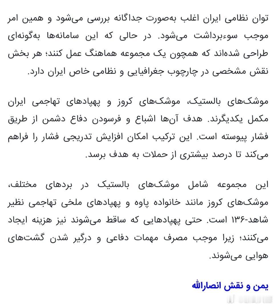 伊朗的军事能力常被单独评估,导致误解。虽然这些系统设计为协调整体,但每个部门在伊朗特定的地理和军事框架中都有独特角色。