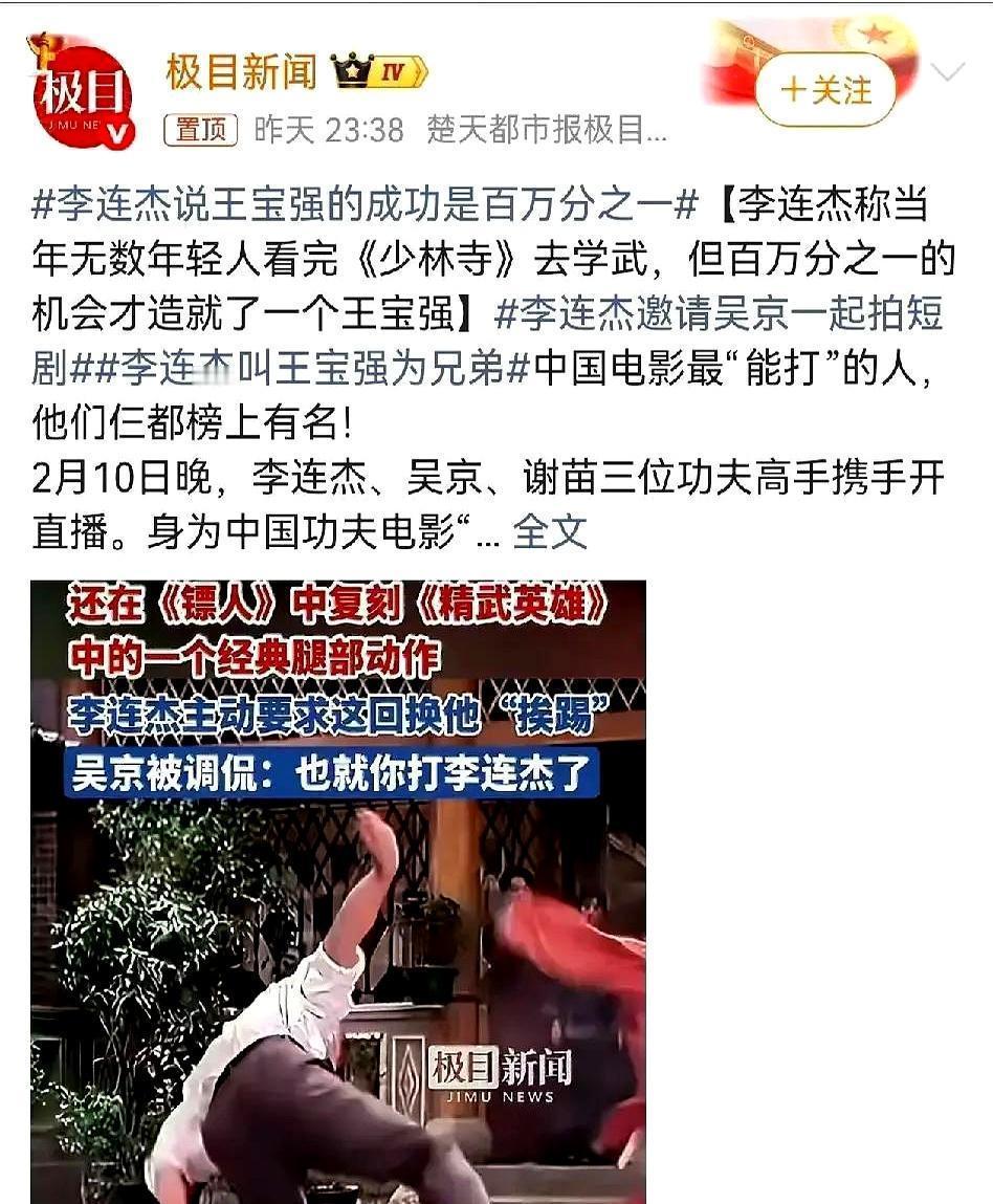 “百万分之一奇迹”的王宝强,戳破了多少武校孩子的血汗梦? 李连杰一声长叹,吴京“影武堂”学生全员出动! 这背后,藏着个让传统武术“起死回生”的惊天大计划,甚至《霍元甲》武术班底都下场了,誓言干翻那些“假功夫”! 别再扯什么“武术凋零”! 那不是凋零,那是被流量和“抠图侠”们活活闷死! 曾几何时,登封200多所武校,如今只剩20多根“独苗”? 剩下的孩子呢? 保安、群演、送外卖,一身腱子肉,一身真功夫,最终磨平在生存线上。 李连杰亲口说,他欠这些习武者一个平台! 这话,字字是血。 好,平台来了!2026年2月10日,李连杰和吴京,直播间里,一声吼! “真功夫短剧计划”——这名字,够硬! 李连杰甘当“筑梦人”,零片酬,亲自下场指导,就一个规矩:不吊威亚、不抠图、不特效! “拳脚见真章”,每一招都得是真的,每一脚都得是狠的! 《源力江湖》,首部短剧,全国武术六项全能冠军孙琳雅挑大梁,李连杰自己,甘当配角! 这叫什么? 这叫“老炮儿”为“新血”铺路,真金白银地砸! 吴京呢? 他更狠! 直接命令“影武堂”学生,全部给我去拍短视频! “大小屏幕皆舞台! ”这话,直接打在那些只盯着大银幕的导演脸上。 你以为只有大荧幕才能出英雄? 错! 真正的英雄,现在都在手机屏里! 那些民间高手,拳拳到肉的视频,以前没人看,现在,机会来了! 当年的《少林寺》点燃了全民武侠梦,那是大银幕的时代! 现在呢? 是手机屏! “特效太假”这四个字,不是观众挑剔,是你们“金贵”的演员,把“人”的价值丢了,把“真实”给忘了! 这场“武林救赎”,不只是一场行动,更是一记耳光,扇在整个娱乐工业的脸上! “是特效太假,还是人太金贵? ”这个问题,你敢答吗? 真正的功夫,只在泥泞的练功场,只在汗水浸透的衣服里! 李连杰和吴京,用血肉之躯,重建一种信仰:功夫,是汗水和磨砺,武者,是文化的脊梁! 他们没走大银幕的“高门槛”,偏偏从小屏幕杀出一条血路! 这不只是为武术正名,更是为那些被遗忘的习武者,找回尊严! 这他妈,才叫“武侠精神”!