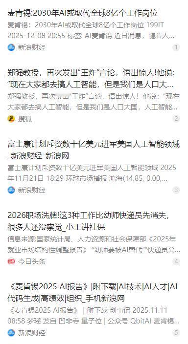郑强教授这话,算是把窗户纸捅破了。他说AI再这么搞下去,饭碗都要成问题了。 麻烦看官老爷们右上角点击一下“关注”,既方便您进行讨论和分享,又能给您带来不一样的参与感,感谢您的支持! 郑强教授关于 AI 发展会威胁普通人就业的话,直接戳中了当下的社会痛点。作为人口大国,AI 的快速普及若不能与劳动力适配,很可能引发一系列社会问题,这番话也让大家正视起 AI 对就业市场的真实冲击。 2022 年底 ChatGPT 问世后,AI 技术的产业化脚步突然加快,不再是实验室里的概念,而是真真切切走进了各行各业。规模化的应用让传统就业市场的变化肉眼可见,尤其是劳动密集型行业,自动化替代人工的趋势越来越明显。 富士康早在 2016 年就启动了 “百万机器人计划”,到 2025 年底其核心生产基地的自动化率已达 75%。2020 到 2025 这五年间,传统流水线岗位减少了约 28 万个,不少一线工人要么转岗,要么面临失业,就业压力实实在在落在了每个人身上。 不仅是蓝领岗位,白领领域也没能躲过 AI 的冲击。那些标准化、重复性的白领工作,比如基础数据录入、简单文案撰写等,正逐步被 AI 替代。不少从事这类工作的从业者,突然发现自己的工作可替代性极强,陷入了转型的迷茫与困境。 人社部 2025 年的相关统计显示,国内低技能岗位的 AI 替代率实际为 23%,并非网传的 32%,未来 5 年仍有近 400 万个低技能岗位会面临重构。AI 不再只盯着体力劳动,对脑力工作的渗透也在不断加深,这让职场人的危机感更重。 AI 技术的迭代速度远超普通人的技能更新速度,尤其是中年群体,大多有家庭和生活的牵绊,学习新技能的时间和精力都有限,转型难度远高于年轻人。面对随时可能被替代的工作,失业压力和社会焦虑也在持续上升。 AI 给企业带来的经济效益是显而易见的,降本增效的效果立竿见影,但技术带来的红利却没能公平分配。麦肯锡 2025 年的 AI 相关报告显示,少数高绩效企业掌握着核心红利,大部分收益最终流向了企业股东和高层管理者。 同时,市场对 AI 相关新兴技术人才的需求激增,这类岗位的薪资水涨船高,成为职场中的香饽饽。而传统岗位不仅面临被替代的风险,薪资增长也十分缓慢,一增一缓之间,行业间的收入分配差距被进一步拉大。 麦肯锡全球研究院预测,到 2030 年全球将有 4 亿至 8 亿个工作岗位面临自动化替代风险,占当前全球总就业岗位的 23%,其中中国约有 1 亿个岗位会受自动化影响,主要集中在制造业、客服、行政等标准化程度高的行业。 制造业作为受冲击最明显的行业,工业机器人的普及让流水线用工需求大幅减少,2025 年全国制造业机器人密度已达每万名工人 392 台,位居全球第一,机器换人已经成为行业发展的必然趋势。 不只是制造业,客服行业的 AI 替代率也居高不下,电话客服替代率达 85%,在线文字客服达 70%,不少企业的人工坐席数量大幅缩减,原本的客服人员要么转岗做复杂投诉处理,要么面临失业。 AI 带来的并非只有岗位消失,也在催生新的就业机会,2025 年国内人工智能、高端服务、新能源等领域新增岗位就超过 1200 万个。职场的核心变化是结构性调整,而非单纯的失业潮,只是这种调整需要时间和适应过程。 那些需要专业知识、共情能力和复杂决策的岗位,比如高端旅游定制、医疗、教育等,很难被 AI 替代,这类岗位的需求也在持续增长。这也给职场人提了个醒,提升自身的不可替代性,才是应对 AI 冲击的核心。 AI 替代的从来都不是人,而是不具备核心竞争力的人,简单重复、没有技术含量的工作,注定会被更高效的 AI 取代。普通人想要不被时代淘汰,唯有持续学习,紧跟技术发展的脚步,及时更新自身的知识和技能体系。 而对于社会层面来说,如何平衡 AI 发展与劳动力就业,如何通过政策调控让技术红利更公平地分配,如何为职场人提供更多的技能培训和转型支持,都是亟待解决的问题。毕竟就业是民生之本,唯有兼顾发展与公平,才能让 AI 真正造福社会。 目前来看,AI 的发展是大势所趋,无法阻挡,与其恐惧和抗拒,不如主动适应。个人找到自身的核心竞争力,企业承担起相应的社会责任,社会做好配套的保障措施,才能在 AI 时代守住更多人的饭碗,让技术发展与社会稳定相辅相成。