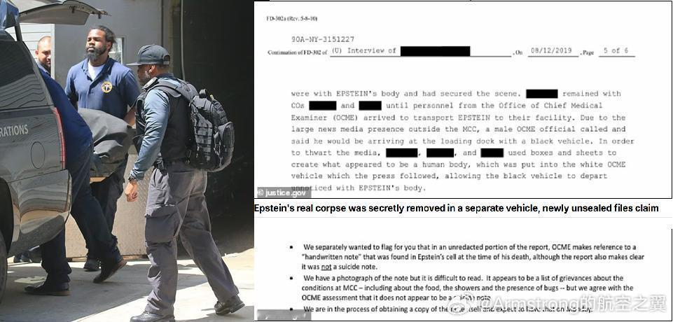 爱泼斯坦假尸体事件披露 根据近期公开的“爱泼斯坦档案” 中的一份联邦调查局(FBI)文件,在2019年8月爱泼斯坦身亡当天,大批媒体聚集在监狱外。为了确保真正的遗体能不受干扰地运往法医办公室,狱警制作了一具“假尸体”以蒙蔽媒体。狱警使用纸箱和床单拼凑出形似人体的装置,然后装上一辆白色法医车运走,成功吸引了大量记者的围堵和尾随。真正的遗体则被装进一辆黑色车辆,从另一个出口“神不知鬼不觉”地运出监狱。