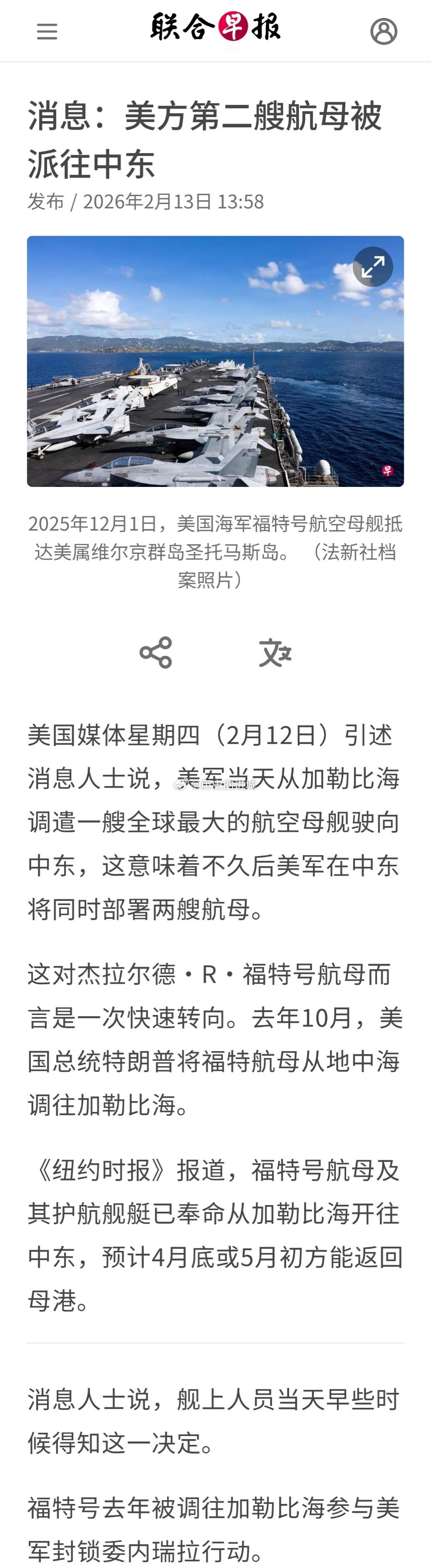 全球最大航母驶向中东美国媒体星期四(2月12日)引述消息人士说,美军当天从加勒比海调遣一艘全球最大的航空母舰驶向中东,这意味着不久后美军在中东将同时部署两艘航母。这对福特号航母而言是一次快速转向。去年10月,美国总统特朗普将福特航母从地中海调往加勒比海。据报道,福特号航母及其护航舰艇已奉命从加勒比海开往中东,预计4月底或5月初方能返回母港。海外新鲜事