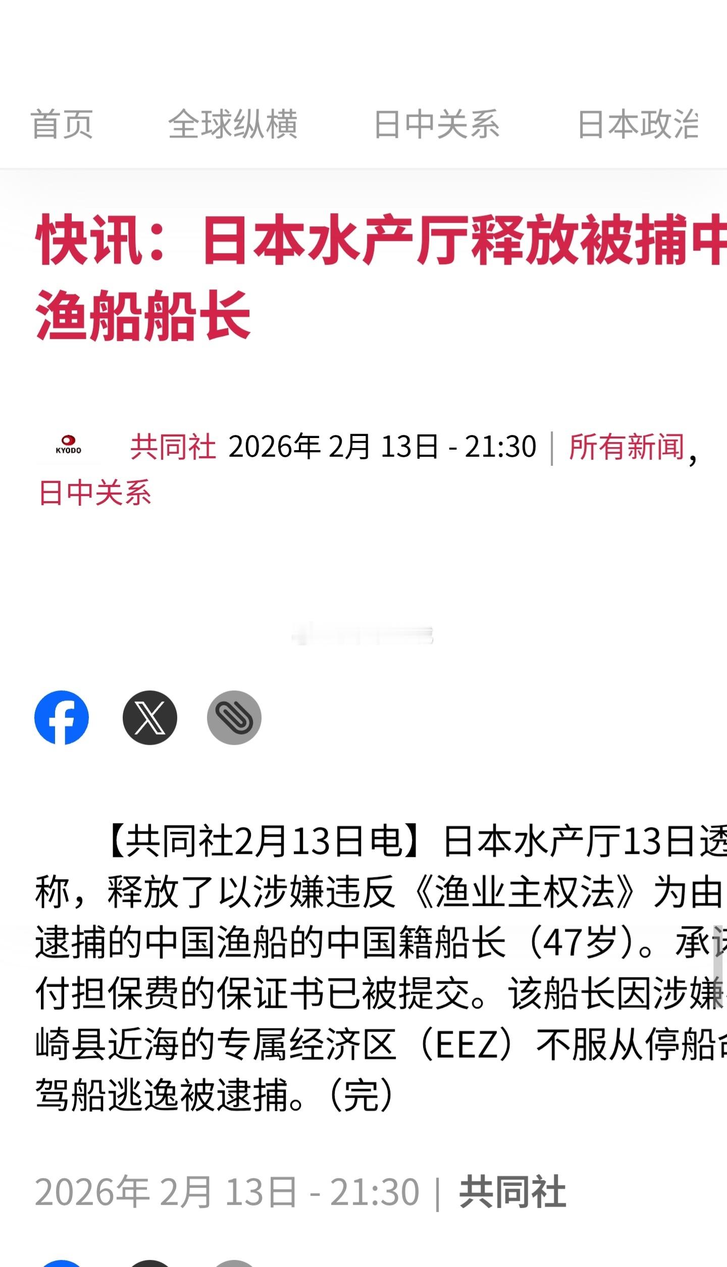 外交部回应日本扣押中国渔船日本共同社报道,日本水产厅13日透露称,之前以涉嫌违反《渔业主权法》为由当场逮捕的中国渔船的中国籍船长(47岁)已经被释放。