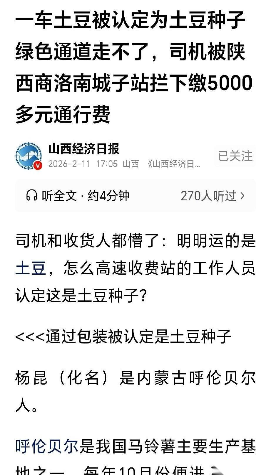 我今天真算是开了眼了。 一车30吨的土豆,拉到高速口,被人拦下来说:你这不对,得交5711块钱。 司机师傅当场就懵了,说我这是鲜活农产品,绿通,免费的啊。你猜收费站的人咋说?人家指着一麻袋一麻袋的土豆,特专业地说:“你这,是种子。不是吃的。” 我差点一口水喷出来。 种子?大哥,30吨种子?这是要去承包个省来种吗? 司机就这么被卡在那了。他一个跑大车的,风里来雨里去,一趟活儿挣的钱可能还没这过路费多。他跟人解释,说订单上写得明明白白是供给超市的食用土豆,可人家不听,就认准了外包装上印的品种和产地,说“这就是种子的标志”。 交警来了,说别堵着路,你先交钱,有事儿回头再说。 行,交了。 结果联系收货人,人家也不认这笔账,说我拉了另一车一模一样的土豆,从别的口下,一分钱没收。凭什么你这儿就要收费? 你看,这事儿魔幻不? 一个普普通通的货车司机,就因为别人一句“你这土豆是种子”,就得自己掏将近六千块钱,白跑一趟不说,还得倒贴。 他能怎么办?他能跟谁横? 他就是一个想赶紧把货送到,然后回家抱抱老婆孩子的普通人。 说白了,有时候压垮一个成年人的,真不是什么惊天动地的大事。 就是这种,你浑身是嘴也说不清,有力气也没处使的憋屈。 幸好最后记者介入,钱给退了,说是“工作失误”。 嗨。 一句“失误”轻飘飘的,可搁在司机师傅身上的那几个小时,那种焦虑和无助,谁来买单? 绿通是多好的政策啊,是国家的温度。 但再好的政策,也得靠人来执行。千万别让个别人的“一句话”,凉了一线劳动者的心。