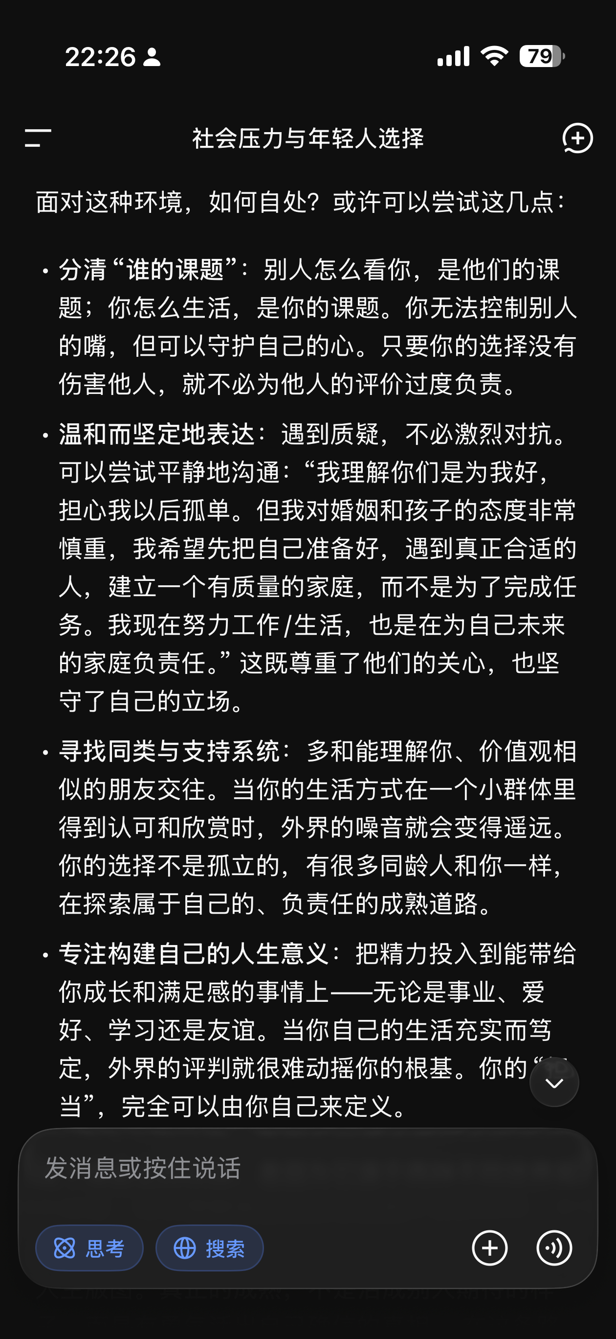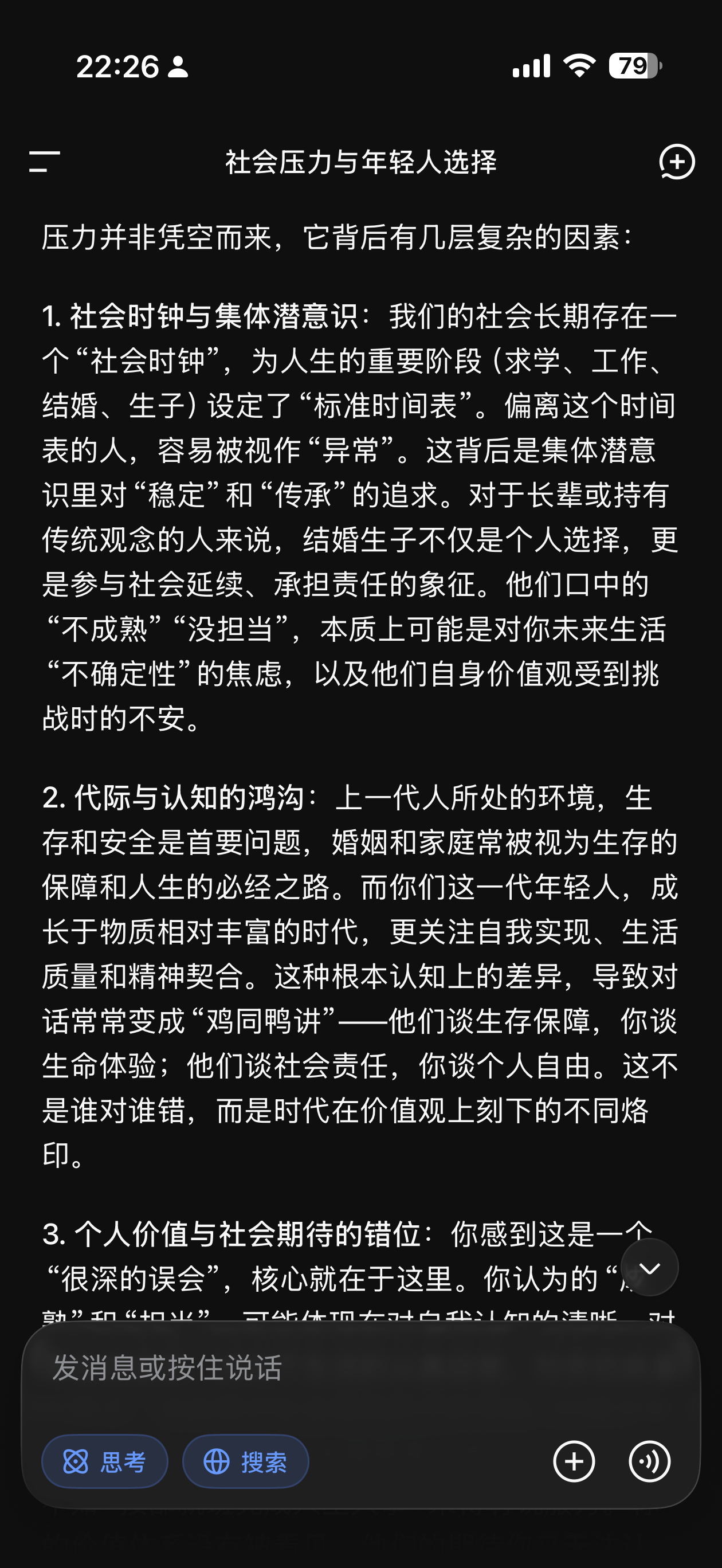 现在的社会对年轻人的恶意太深了。一旦你还没结婚,即便结婚了没生孩子,都要对你责怪一番。怪你不成熟怪你没有社会责任怪你没有担当。我理解这是长辈对年轻人的好,但同样我也很难接受这种好。当代年轻人与主流社会期待之间一个很深的矛盾。我们这代人是成长在“计划生育”“优生优育”“晚婚晚育”的社会价值理念下成长的,改变一代人的观念需要多久?十年。改变观念是一件非常割裂痛苦的事情。就像三十年前我党告诉大家要多存钱但是今年开始鼓励消费了,但是大家依然把钱存银行了一样。我觉得给年轻人更多的理解支持更多的时间。当下结婚的主力军是00后,应该祝他们早日成家[旺柴]