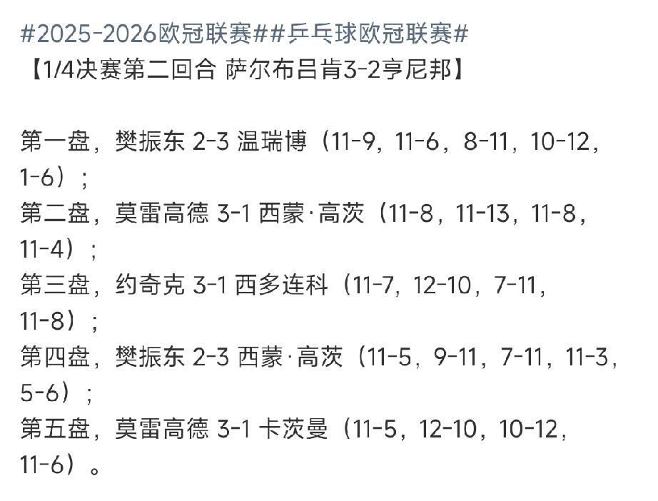 樊振东输球了! 樊振东在今天的欧冠1/4决赛中 2-3不敌温瑞博 2-3不敌西蒙高茨 同样的比分,同样是被逆转 樊振东输球,其实也很正常 并非大爆冷 而温瑞博的战胜老大哥樊振东,而且是大比分0-2落后,第四局又1-6,6-9落后的情况下挽救一个赛点实现逆转,温瑞博这位小将展现出过硬的心理素质。这位19岁小将未来可期,更重要的一点。 温瑞博今年已经战胜过雨果卡尔德拉诺、杜达、达科、弗朗西斯卡等乒坛名将。 樊振东被逆转,属于比赛状态的一些起伏。 而在队伍已经出线的情况下,樊振东随后又2-3输西蒙高茨,而且决胜局5-3领先被6-5反超逆转。 樊振东前面一直连胜,连胜记录被打断,而樊振东目前已经获得伦敦团体世锦赛资格,如果东哥能回归国家队,对于自身的实力,提升是有很大帮助的,毕竟国家队的训练是其他无可比拟的。而且若能回归,那么国乒卫冕可能将会大大提升。 昨天也已经出炉洛杉矶奥运会比赛规则,参赛人数还是3人,每个人可能都将会兼项,早些回归,对于队伍的磨合至关重要。参赛男女各3人,混双可以2对,男单女单各2人,男双女双各一对。 那么你们觉得樊振东会再上奥运吗?