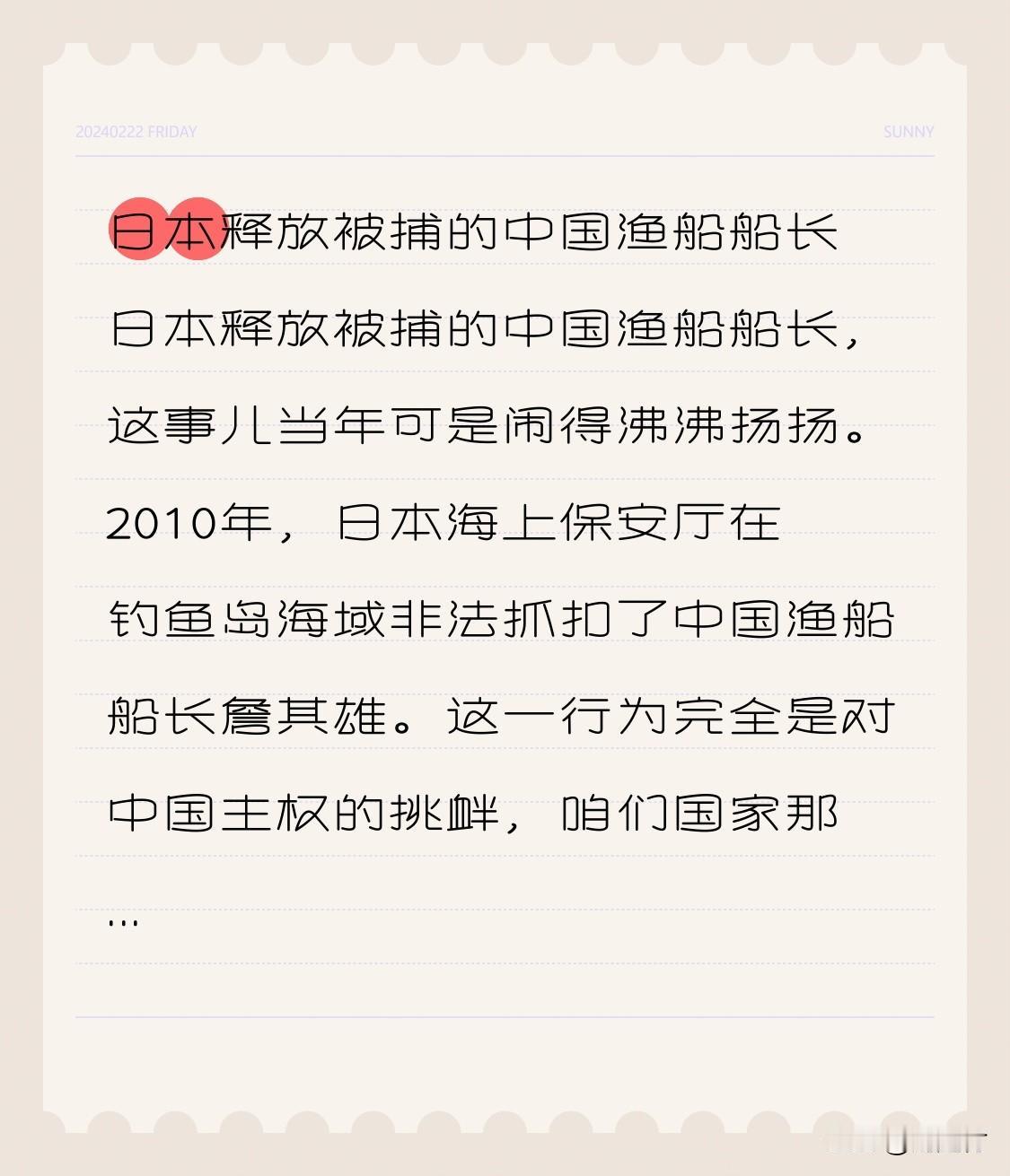 日本释放被捕的中国渔船船长 日本释放被捕的中国渔船船长,此事当年闹得沸沸扬扬。2010年,日本海上保安厅在钓鱼岛海域非法抓扣中国渔船船长詹其雄,这是对中国主权的公然挑衅。我国强硬表态,坚决要求日本放人。 在强大外交压力下,日本最终释放詹其雄。这一事件彰显了国家维护主权和公民权益的决心。钓鱼岛是中国固有领土,任何侵犯我国领土主权的行为都不会得逞。詹其雄船长面对日本非法扣押毫不畏惧,展现了中国人的骨气。此事时刻提醒我们,要坚决捍卫国家每一寸土地。