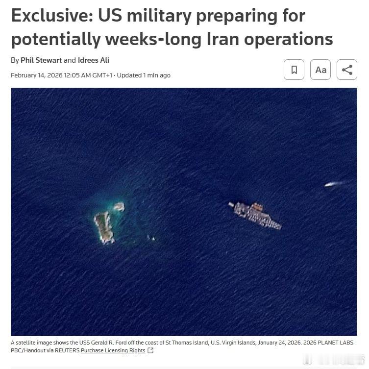全球最大航母驶向中东据路透社报道,若特朗普授权采取军事行动,美国军方正为可能对伊朗展开持续数周的军事行动做准备。