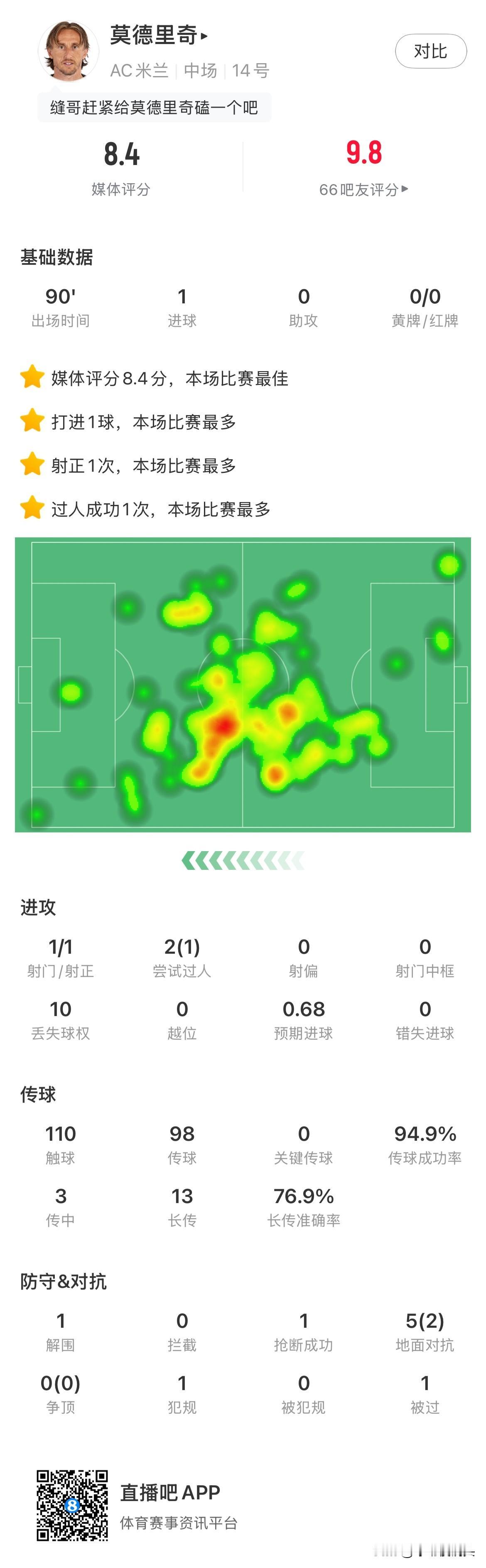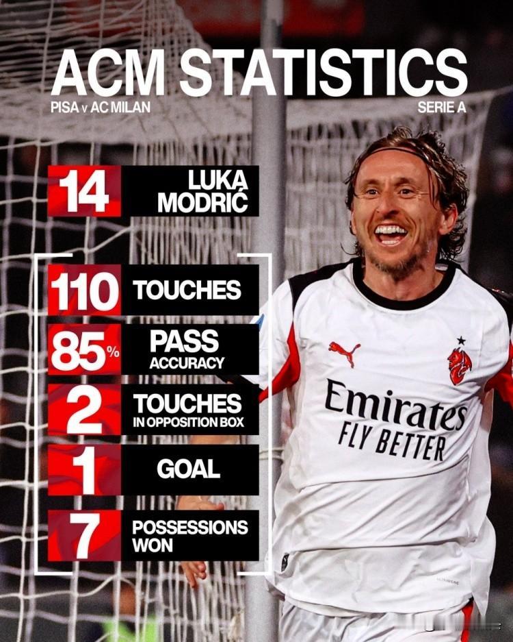 全场最佳又是莫德里奇! 原以为去意甲养老了,万万没想到最后成了大腿,皇马主席老佛爷估计肠子都悔青了! 莫德里奇再度奉献绝杀,AC米兰客场2:1比萨,艰难取得宝贵的3分! 110次触球,7次夺得球权,85%传球成功率,2次禁区触球,1进球! 40岁的莫德里奇完全有继续留在皇马的能力,哪怕就是踢个替补,也比某些人强!皇马当初就应该1年1签留下魔笛,也不至于本赛季又要四大皆空! 莫德里奇