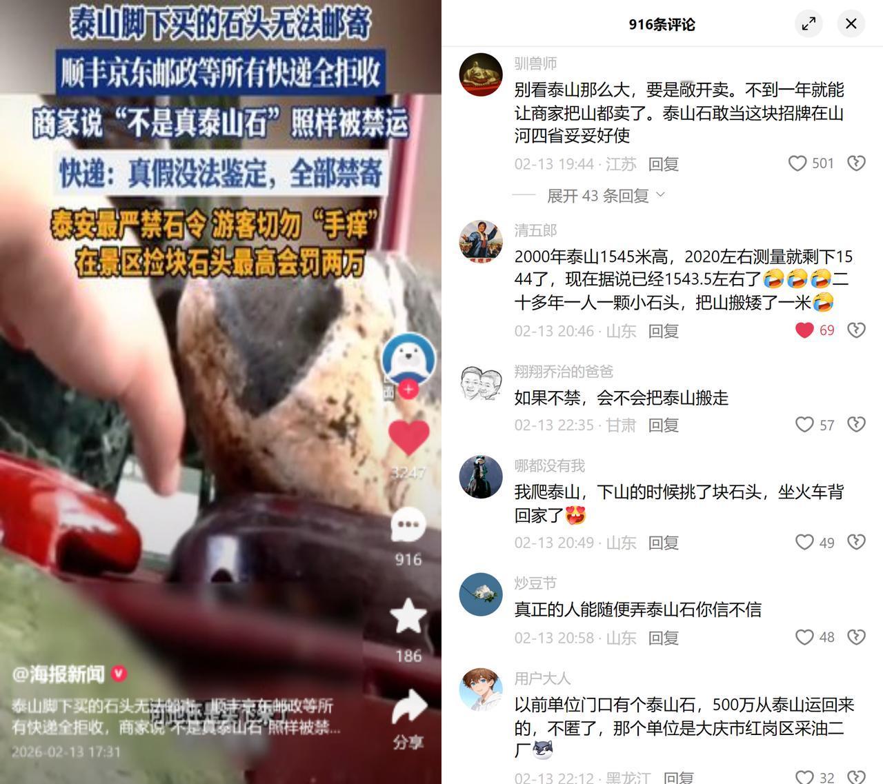 游客买假泰山石,只能人肉背走 元旦河北游客爬泰山,在山脚买了块假泰山石。 找遍顺丰、京东、所有快递,全被拒收。 快递说真假没法鉴定,一律禁寄,响应泰安的最严禁石令。 这禁令是怕800万游客一人一块搬空泰山,捡石头最高罚两万。 最后游客只能把石头塞行李箱,坐高铁人肉背回河北。 说真的,禁令初衷我能理解,800万人一人抠一块,泰山确实扛不住。 但执行起来也太一刀切了吧! 这假石头本来就是从河北拉来的仿品,跟真泰山石八竿子打不着,为啥也不让寄? 合着快递是嫌鉴定麻烦,直接一禁了之,省心倒是省心了,游客的麻烦谁管? 更讽刺的是啥? 有人说某单位花500万买了块巨型真泰山石,大摇大摆运回去当门面。 普通人带个小工艺品都要背高铁,某些人却能搬真的大石头? 这双标玩得也太溜了吧! 规则是用来保护资源的,本不该给普通人添堵、给特权开绿灯。 能不能别光顾着一刀切,多给点弹性,也管管那些真正的漏洞? 就问这事儿,谁看了不膈应?