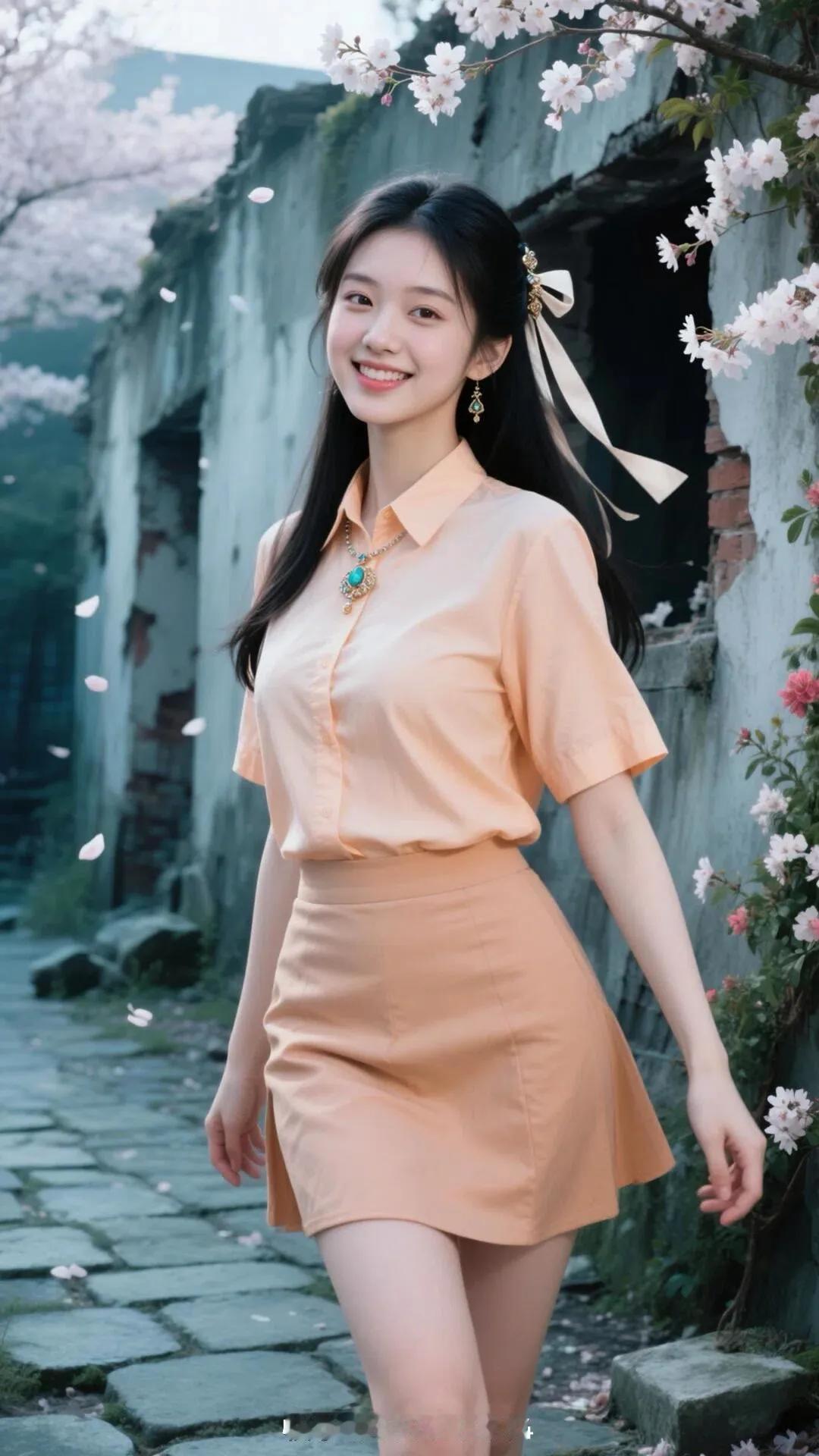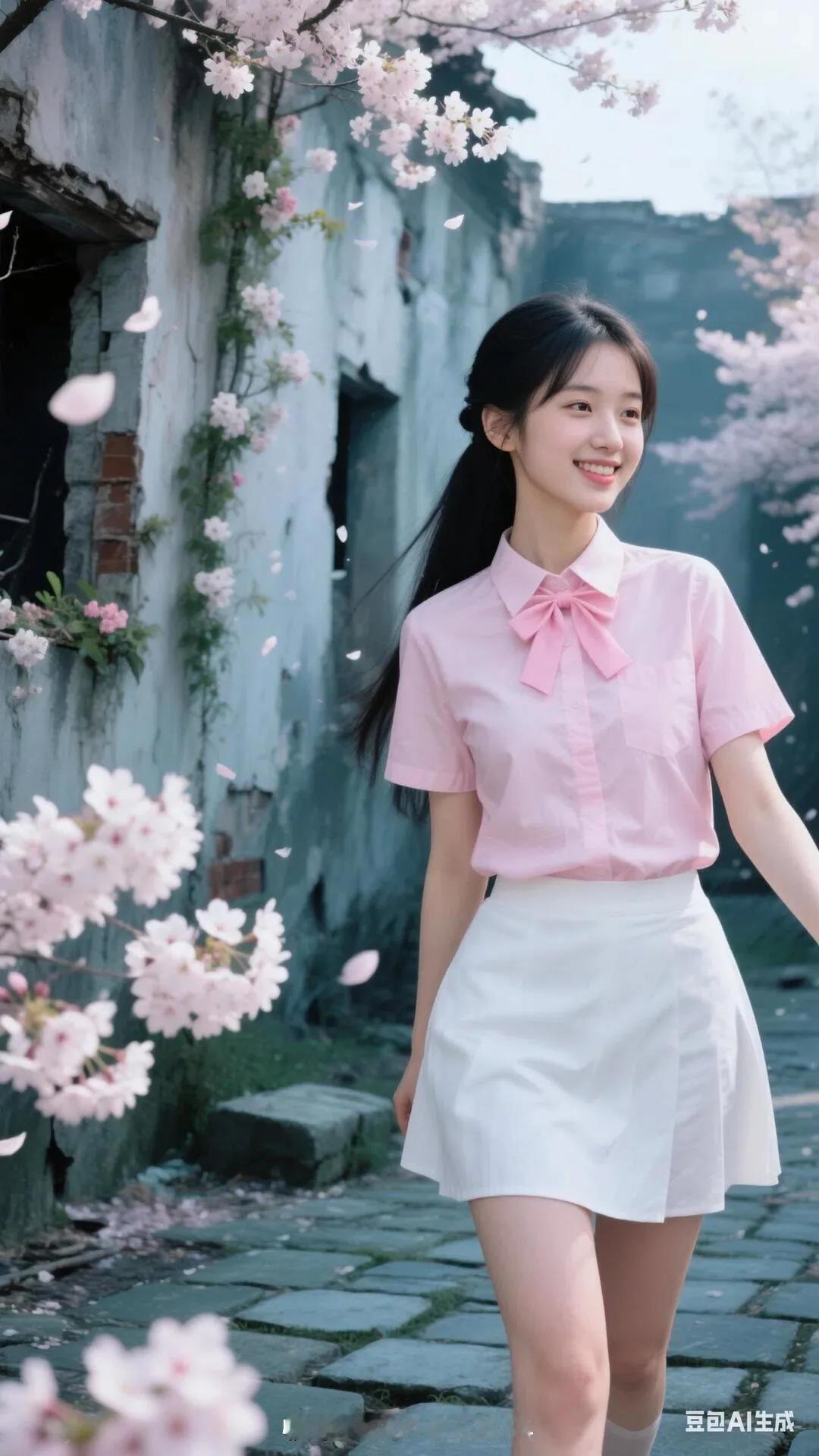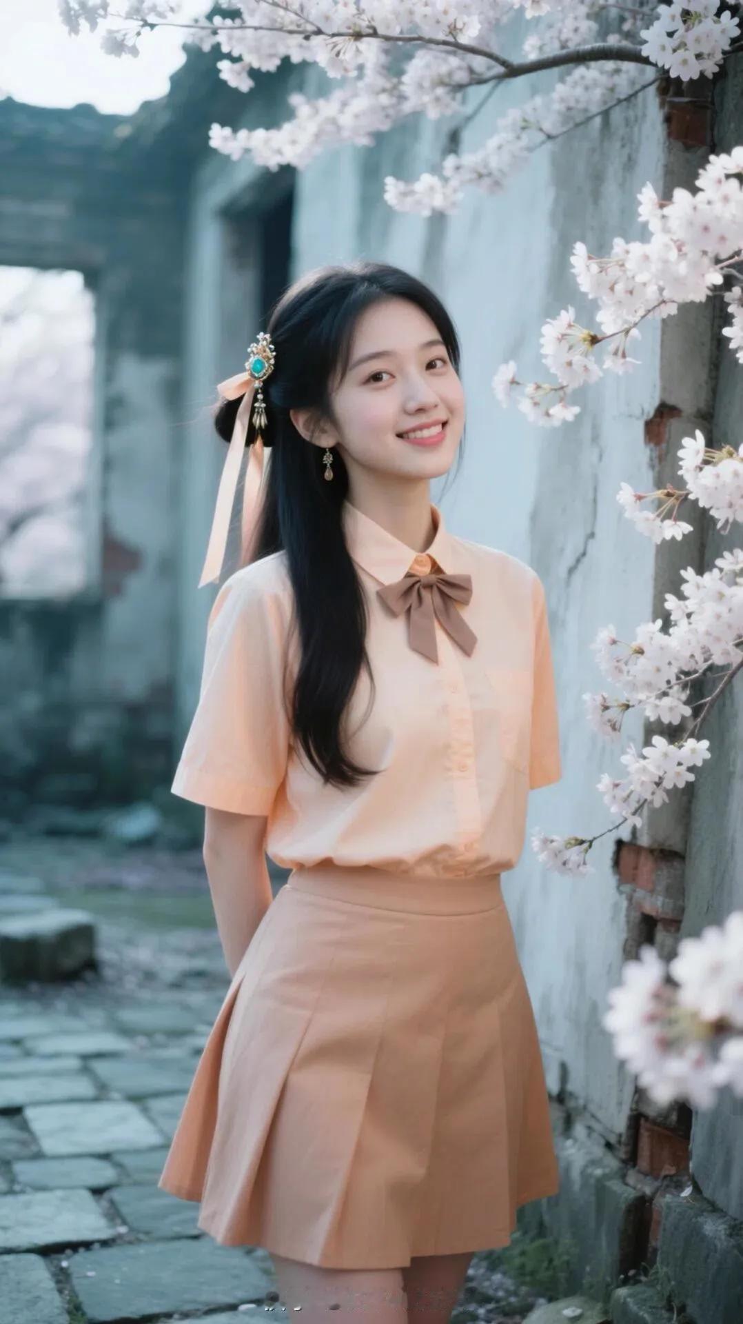 春日少女,粉裙飘逸,古风韵韵,花影婆娑。