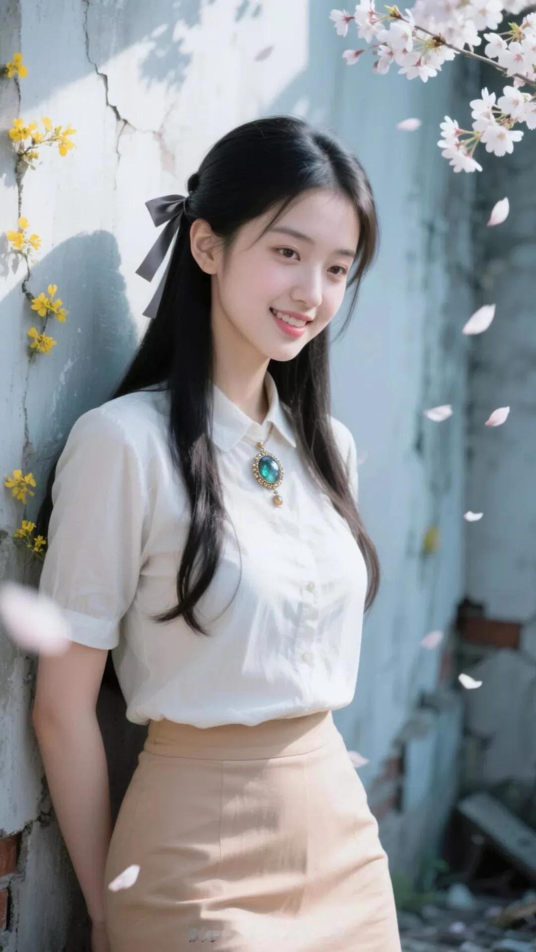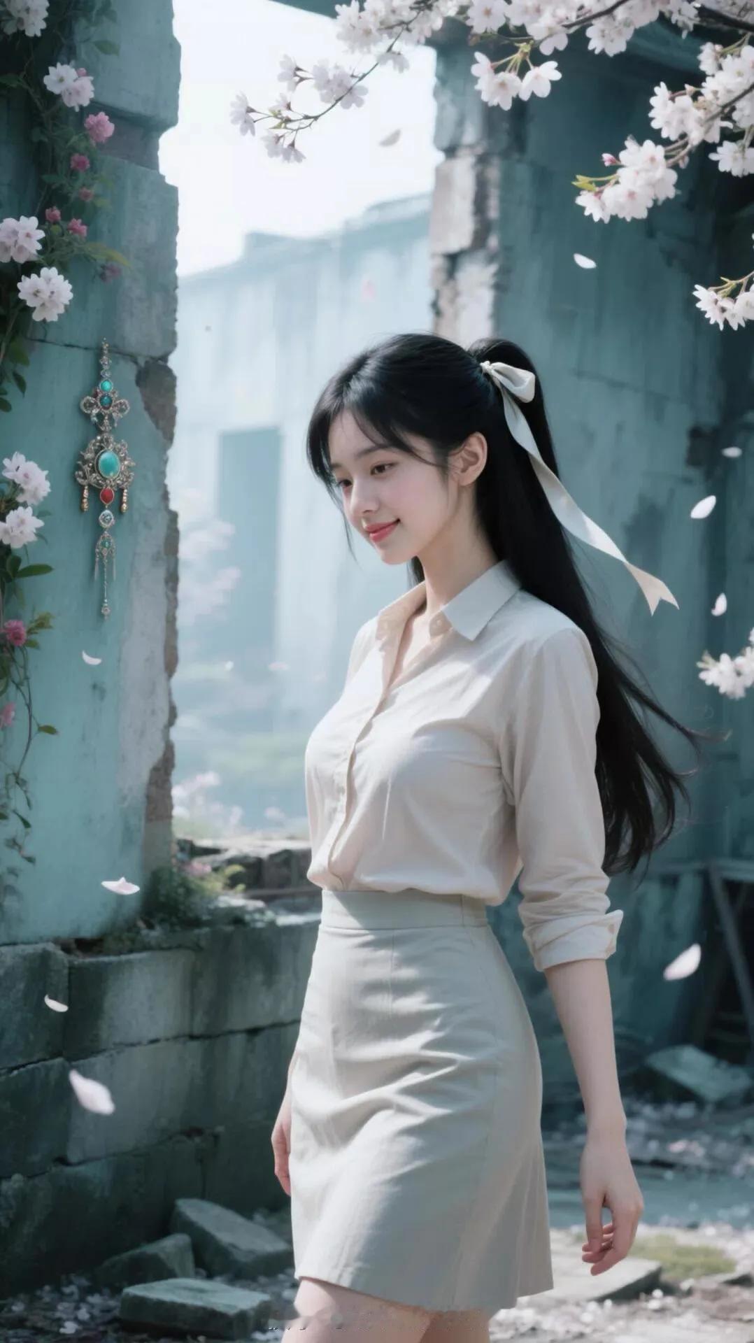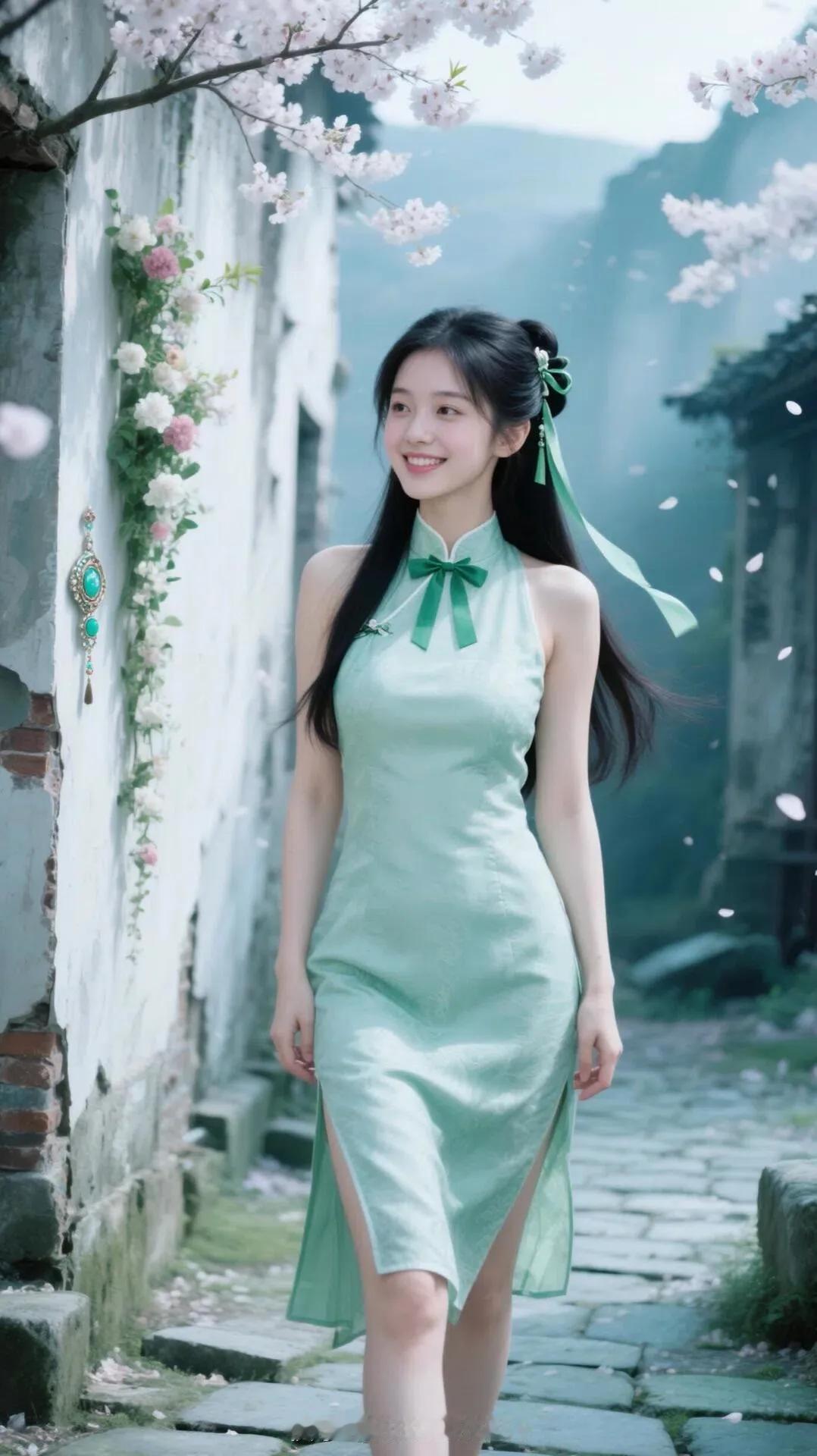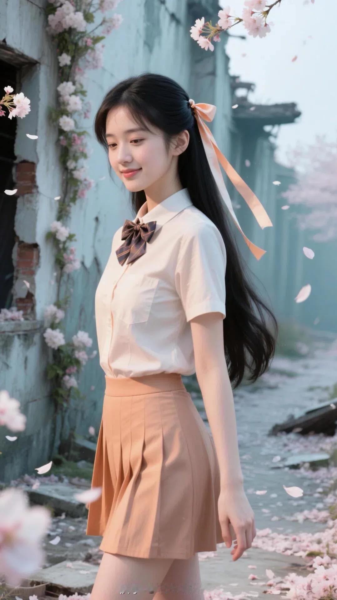 春日少女,粉裙飘逸,古风韵韵,花影婆娑。