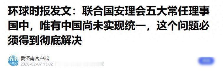 中国还没完成统一,台湾还在分治,五常里只有我们卡在这一步 2026年春节前,环球时报评论员北平锋发表了一篇文章,标题为“台湾该醒了”,这篇文章。 我们常说统一是大势所趋,但这次换个角度看看,作者把美俄英法四个国家拉出来,一条条分析它们怎么处理内部的分裂问题。美国在1865年打完南北战争后,宪法直接写明了联邦不可分裂,后来海外领地算作领土延伸,不算独立实体;俄罗斯在90年代打车臣、收克里米亚,慢慢把边界定下来;英国让苏格兰在2014年公投,结果没通过,中央政府仍然掌握最终决定权;法国给科西嘉高度自治,但宪法白纸黑字写着国家不可分割,没给独立政府留位置。这四个国家不管过程多难,最后都把“一个国家、一个主权”这事落实了,而我们这边的情况是,对面的政治实体连联合国席位都没有,却长期实际运作,这是五常里唯一出现的情况。 有人觉得七十六年过去,时间久了大家就习惯了,其实不是时间的问题,是实力差距拉开了,2025年大陆的GDP是台湾的22倍,台企有七成供应链绑在大陆,外贸上根本离不开,军事上更明显,东风-17高超音速导弹已经部署,歼-35舰载机形成战力,台海周围封控体系不是演习,是日常推演的常态,年轻人态度也变了,大陆92%的青年认为统一是历史责任,以前两岸交流多,反而容易模糊界限,现在来往少了,认同感反而更强了。 很多人觉得统一条件成熟就是等着军演变成实战,实际上这事要复杂得多,法律方面早在2005年《反分裂国家法》就划出了底线,2023年全国人大常委会再次强调一个中国原则必须坚持,国际上已经有181个国家承认我们,台湾只剩下很少几个邦交国。