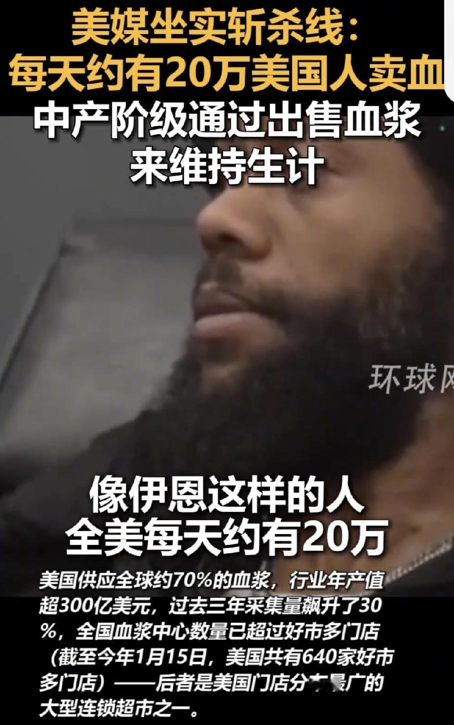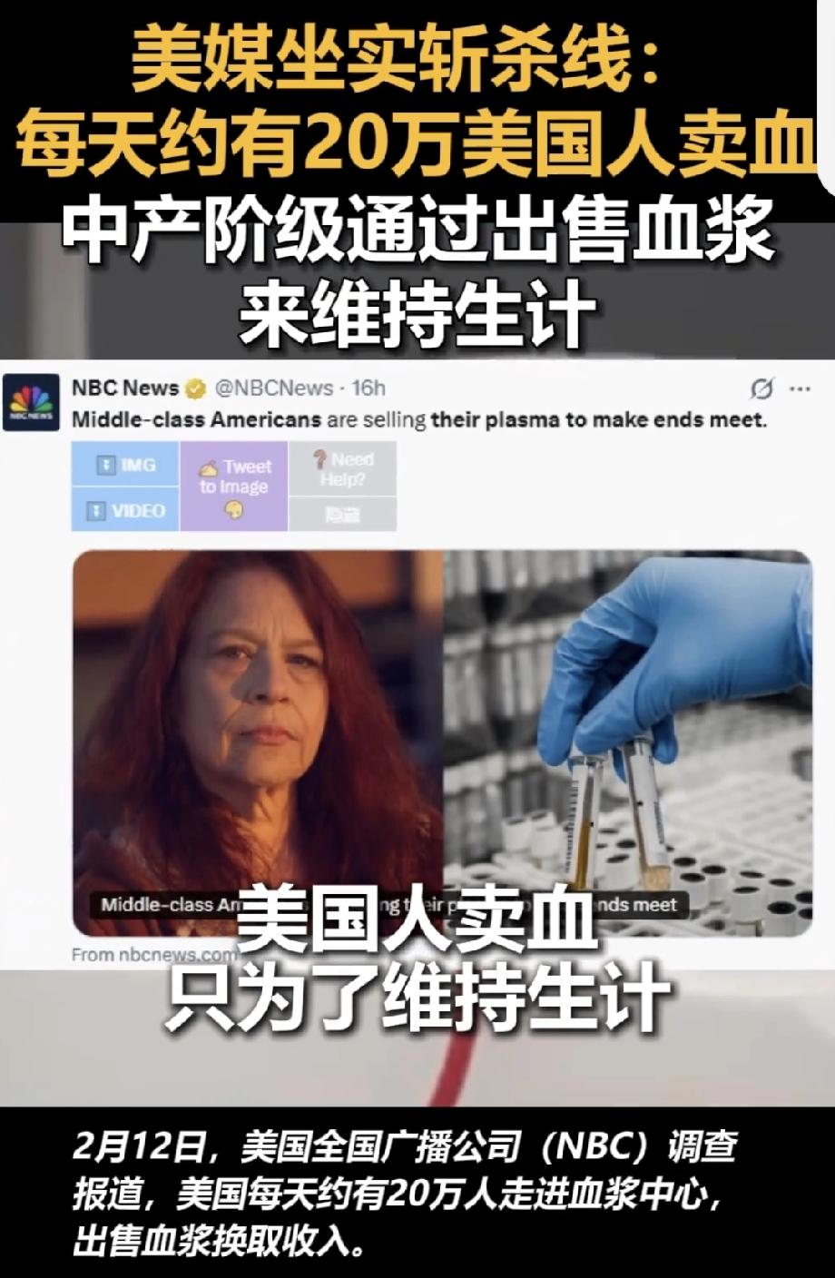 美媒坐实斩杀线:每天约20万人卖血 美媒这报道真是炸锅了,每天约20万人卖血,揭开了全球血液经济背后的隐秘链条。像《纽约时报》联合调查,覆盖12个中低收入国家,发现全球每日卖血人数在18万至22万,年交易量超7000万人次。所谓“斩杀线”,就是贫困人群为生计卖血,结果健康越来越差。 更惊人的是美国中产阶级也加入卖血大军。像吉尔·张伯伦,以前年薪8.7万美元,裁员后时薪低,还得卖血浆付账单。这现象把美国经济压力和社保问题暴露无遗,维持生活开销太难,很多人只能出卖身体资源,太无奈了。
