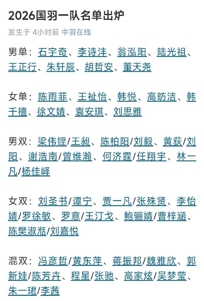 2026国羽一队名单出炉,来自中羽不保真 男单:石宇奇,李诗沣,翁泓阳,陆光祖,王正行,朱轩辰,胡哲安,董天尧 女单:陈雨菲,王祉怡,韩悦,高昉洁,韩千禧,徐文婧,袁安琪,刘思雅 男双:梁伟铿/王昶,陈柏阳/刘毅,黄荻/刘阳,谢浩南/曾维瀚,何济霆/任翔宇,林一凡/杨佳峄 女双:刘圣书/谭宁,贾一凡/张殊贤,李怡婧/罗徐敏,罗意/王汀戈,鲍骊婧/曹梓涵,陈樊淑湉/刘嘉悦 混双:冯彦哲/黄东萍,蒋振邦/魏雅欣,郭新娃/陈芳卉,程星/张驰,高家炫/吴梦莹,朱一珺/李茜 单打组均为8人满额,双打组为6对12人满额。 春节冬训后,马年赛事将从德国公开赛为起点,逐渐拉开序幕,今年的赛事焦点无疑是汤尤杯、世锦赛和亚运会。最近一直表现出色的胡珂源/林祥毅,为啥没进一队呢?还有何济霆居然还能回一队,他可不是只辱骂队友这么简单吧。。。
