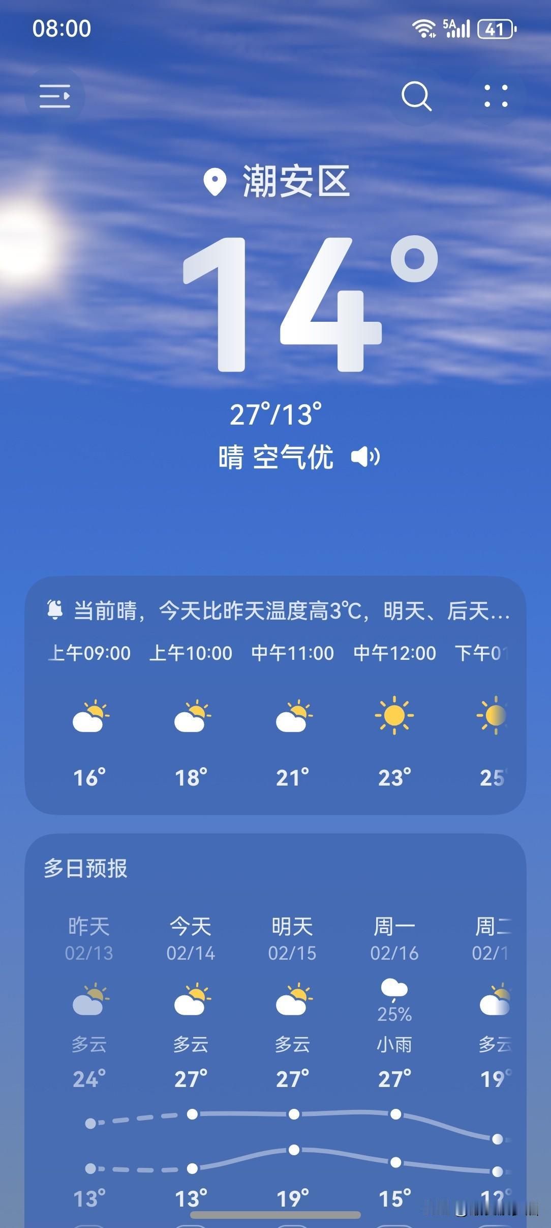 春节假期广东有2次冷空气过程! 14~16日,广东大部市县温暖和煦,早晚有轻雾,西部市县和粤西海面局部有大雾,北方一股中等强度冷空气前锋将于16日(除夕)开始影响广东! 今天(14日),潮州喜提一个多云天气,气温13~27℃,此刻气温14℃,体感温度11℃。 哇~今天的最高气温将上升到27℃呢!这是怎么回事?暖得有点过火了吧?真的是直冲30℃呢! 一起来看看今天的天空吧!阳光灿烂,美好的一天又开始啦! 距离2026年春节仅剩3天啦!小伙伴们!你们的年货准备得怎么样了呢?大扫除都做完了吗? 天气晴好,春节前的打扫活动是时候该行动起来了啦! 今天的这样天空,又是凭实力拥有一个五星好评! 如此天气!元芳,你怎么看? [我想静静][捂脸][笑哭][大笑][我想静静][捂脸][笑哭][大笑]