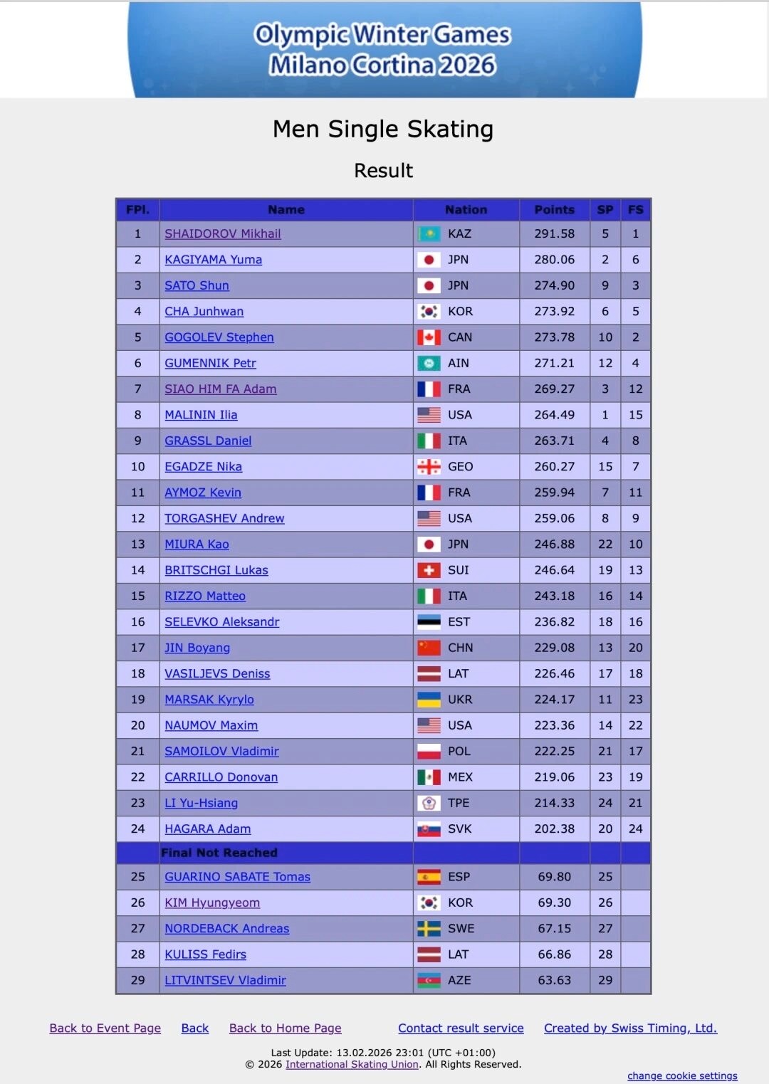 哈萨克斯坦选手萨多洛夫凭借稳定的发挥,自由滑拿到198.64分,总分拿到291.58分,最终更是坐在KC区,看着一个又一个的烟花,拿到了哈萨克斯坦的第一枚花滑金牌。马里宁自由滑重大失误